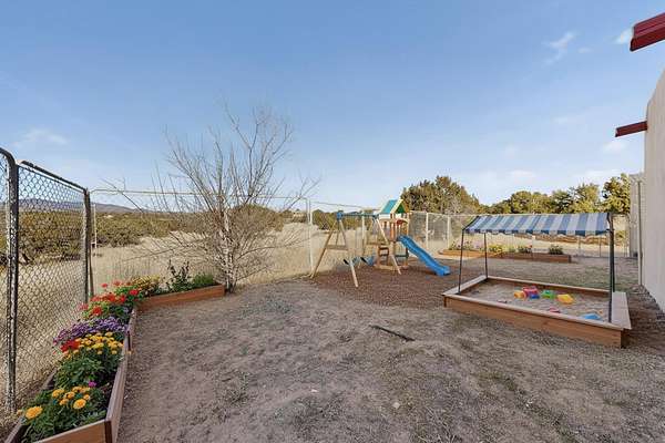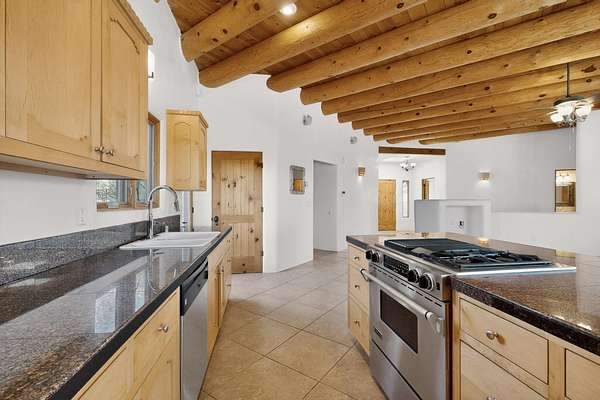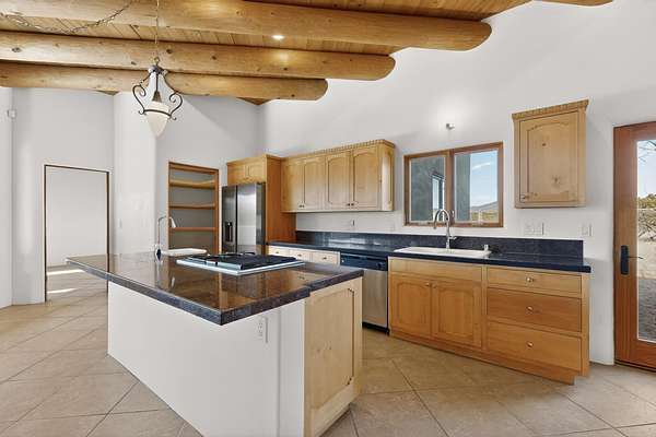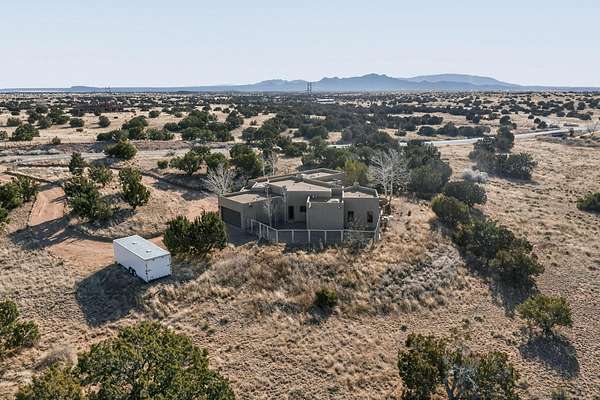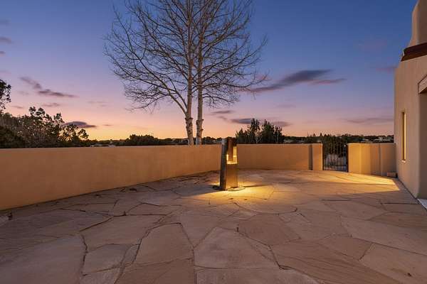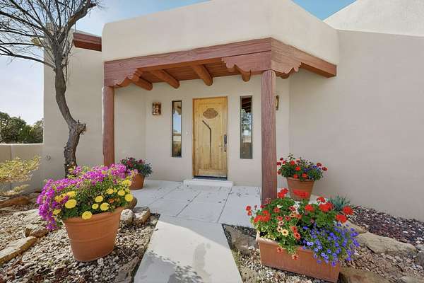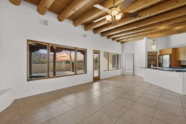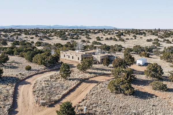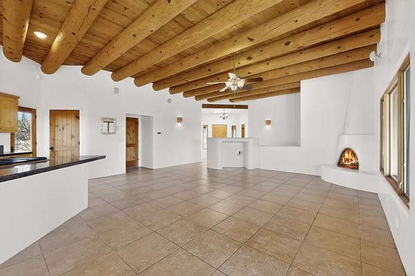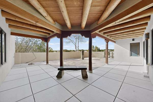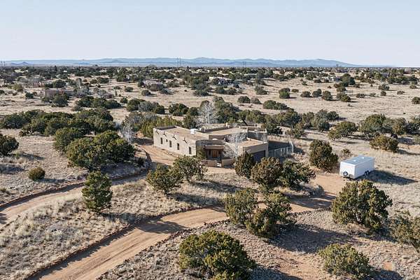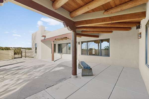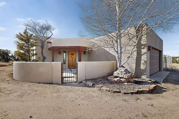 Absolutely beautiful, freshly painted, filled with natural light and views, this single-level home features diamond-finish plaster walls, a split-bedroom floorplan, 2,216 +/- sq ft, 3 bedrooms plus an additional flex room, 3 baths, and a finished 2-car garage. Located on a private +/-4.24-acre lot with amazing sunsets, it offers serenity and classic Santa Fe charm. Enter through the front enclosed courtyard into an inviting, spacious living and dining area with high ceiling, vigas, and a kiva fireplace that add warmth and character. Doors lead to the rear enclosed courtyard with natural stone, and a large, covered porch that provides multiple sitting areas perfect for entertaining and usable outdoor living. The generous kitchen offers abundant cabinetry, granite countertops, stainless steel appliances, two pantries (including a walk-in), and a large island ideal for casual dining or hosting gatherings. Privately located on one side of the home, the primary suite features high ceiling, vigas, a kiva fireplace, an abundance of light and an ensuite bath with a separate tub, walk-in shower, private toilet, two sinks, storage and two walk-in closets. The opposite wing includes two bedrooms connected by a Jack-and-Jill full bath, a half bath, laundry space, and a versatile room perfect for an office, studio, or playroom with a closet. Extra storage space along the interior hallways and in the garage. Additional highlights: NEW Septic tank (2026)-Radiant heat-Evaporative Cooling-Tile floors (no carpet)-No stairs-Fenced in area near kitchen-Wood doors throughout-Skylights-Ceiling fans-Convenient circular driveway with easy access-Tons of on-site parking and much more. Ready to move in! This property is not part of the Eldorado HOA providing flexibility with building rules subject to county approval.