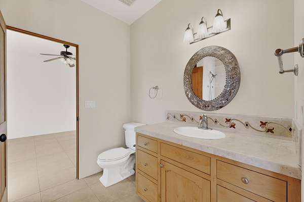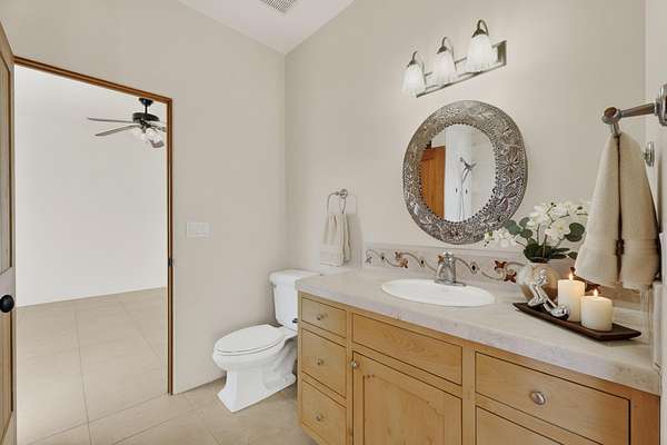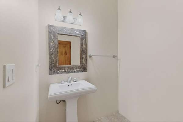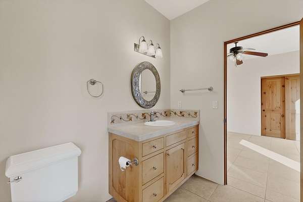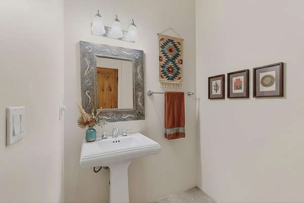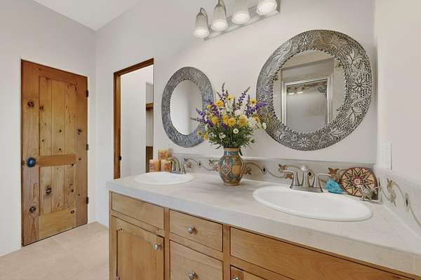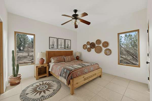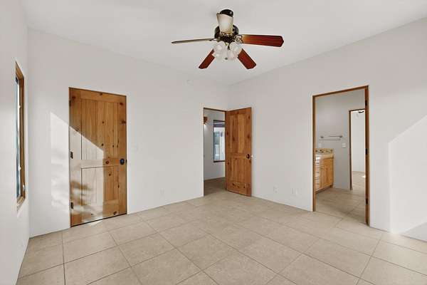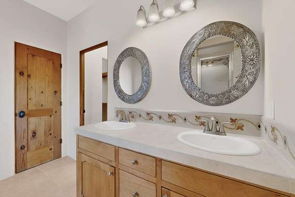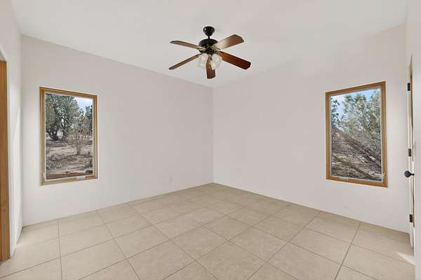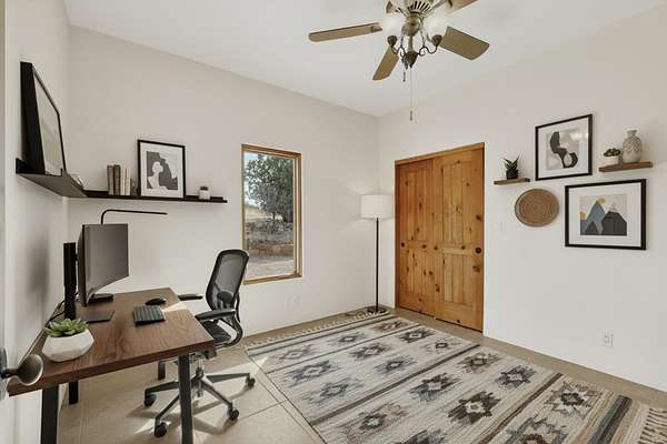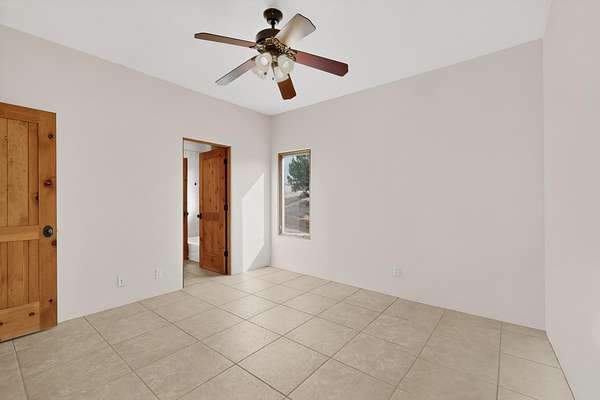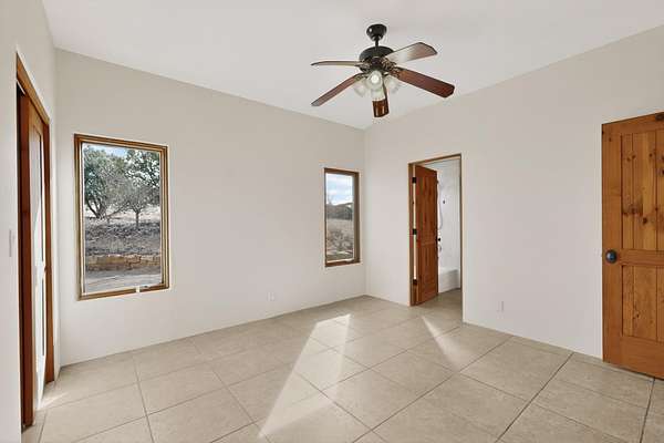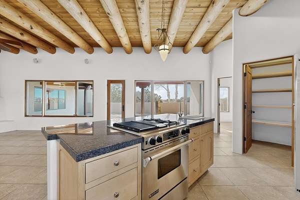 Absolutely beautiful, freshly painted, filled with natural light and views, this single-level home features diamond-finish plaster walls, a split-bedroom floorplan, 2,216 +/- sq ft, 3 bedrooms plus an additional flex room, 3 baths, and a finished 2-car garage. Located on a private +/-4.24-acre lot with amazing sunsets, it offers serenity and classic Santa Fe charm. Enter through the front enclosed courtyard into an inviting, spacious living and dining area with high ceiling, vigas, and a kiva fireplace that add warmth and character. Doors lead to the rear enclosed courtyard with natural stone, and a large, covered porch that provides multiple sitting areas perfect for entertaining and usable outdoor living. The generous kitchen offers abundant cabinetry, granite countertops, stainless steel appliances, two pantries (including a walk-in), and a large island ideal for casual dining or hosting gatherings. Privately located on one side of the home, the primary suite features high ceiling, vigas, a kiva fireplace, an abundance of light and an ensuite bath with a separate tub, walk-in shower, private toilet, two sinks, storage and two walk-in closets. The opposite wing includes two bedrooms connected by a Jack-and-Jill full bath, a half bath, laundry space, and a versatile room perfect for an office, studio, or playroom with a closet. Extra storage space along the interior hallways and in the garage. Additional highlights: NEW Septic tank (2026)-Radiant heat-Evaporative Cooling-Tile floors (no carpet)-No stairs-Fenced in area near kitchen-Wood doors throughout-Skylights-Ceiling fans-Convenient circular driveway with easy access-Tons of on-site parking and much more. Ready to move in! This property is not part of the Eldorado HOA providing flexibility with building rules subject to county approval.