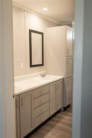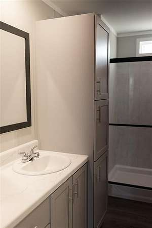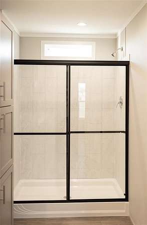 The primary bathroom hosts a glass door extra large walk in shower, double vanity sinks, a linen closet and extra storage.