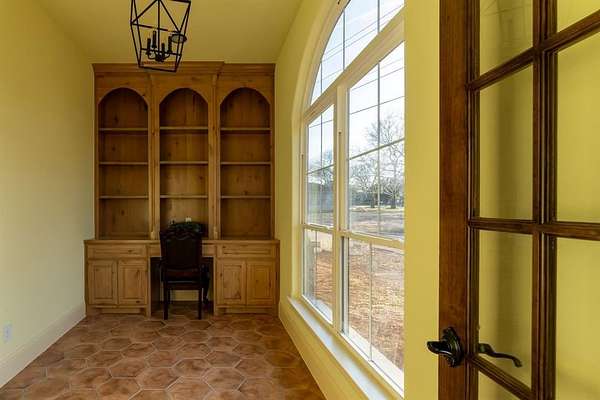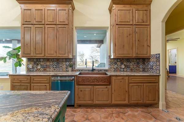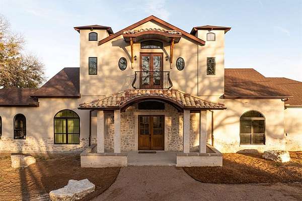 Discover your dream oasis in this stunning Spanish-style home nestled just outside the city limits of Springtown. Set on 2.33 acres, this exquisite residence boasts 5 bedrooms, each with its own ensuite bath, offering ultimate privacy and comfort for family and guests. With a generous 4,228 square feet of living space, the open floor plan is adorned with custom woodwork and beams, creating an inviting atmosphere centered around a beautiful wood-burning fireplace.