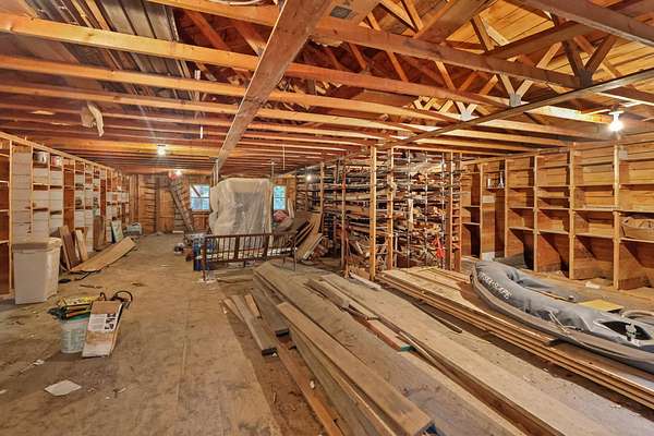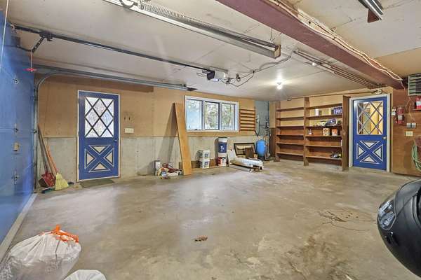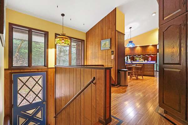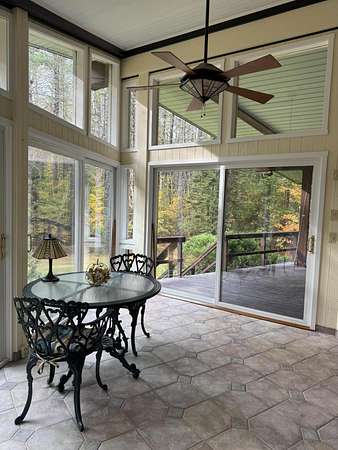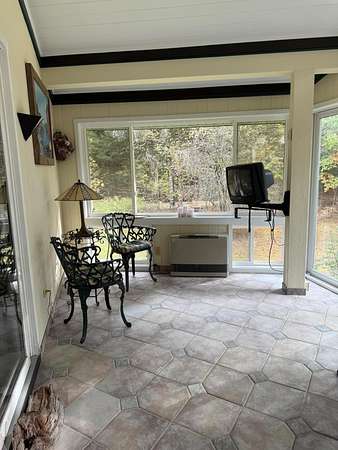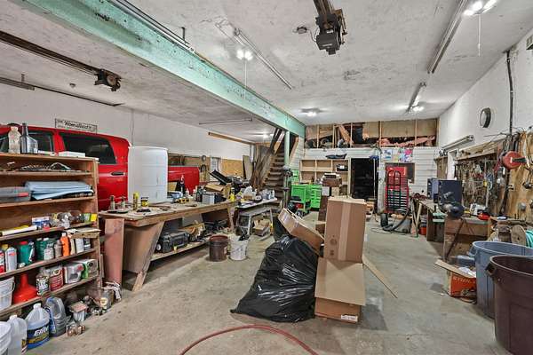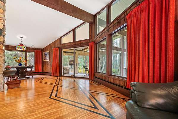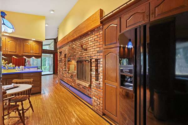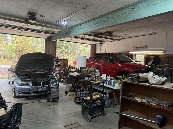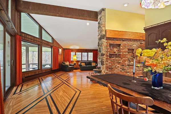 This home is the 10+ acre estate of George Homstead, one of the best known contractors in the area. The home is situated up the 250' driveway surrounded by woods for privacy and enjoying nature from the back glassed in sitting room. George designed his home with unique angles and with floor to ceiling stone fireplaces. The kitchen offers a built in pizza oven in the brick wall and a wood fireplace. The dining room and living rooms open to a glass from floor to ceiling sitting room and an attached deck. The hardwood flooring in the living and dining rooms are a special design, created by George's wife Shirley, who was an artist as well. Tiffany styled lighting shows the artistic tastes that she added to the home's decor. The master bedroom spreads the entire length of the front of the home with many windows for natural lighting. The home office features a built in desk, file cabinets and safe. The wood walls on the main floor add to the natural beauty of this one-of-a kind home. The stone fireplace is carried through to the ground level with a family room and two bedrooms, plus a bathroom and laundry room. The extra large two bay garage is heated and ample room for two cars plus any recreational toys you may have. The BONUS on this property is the two bay 32x52 commercial style garage with upstairs storage as well. This garage was built with steel beam and hurricane style tresses for strength and longevity. This is a mechanics dream garage.( Note: this is not a commercial property)