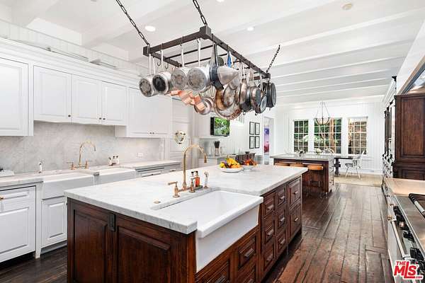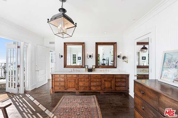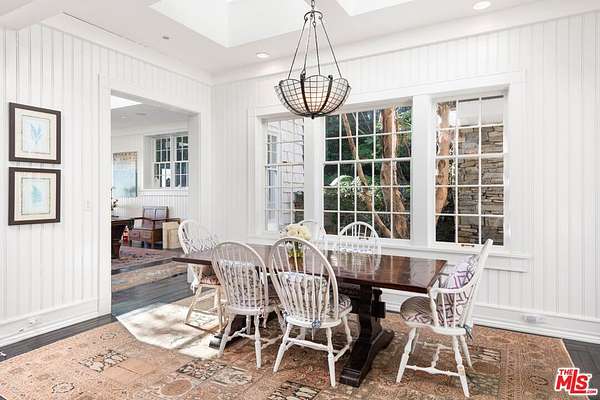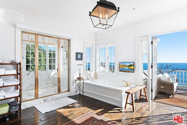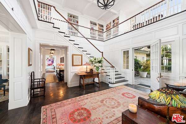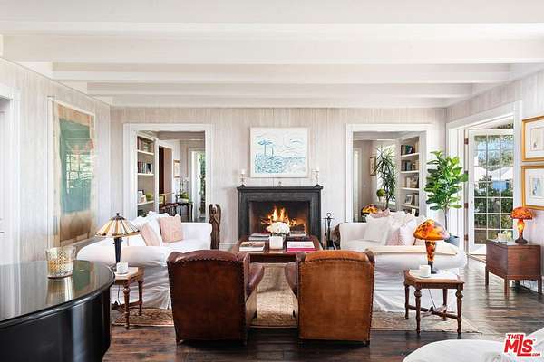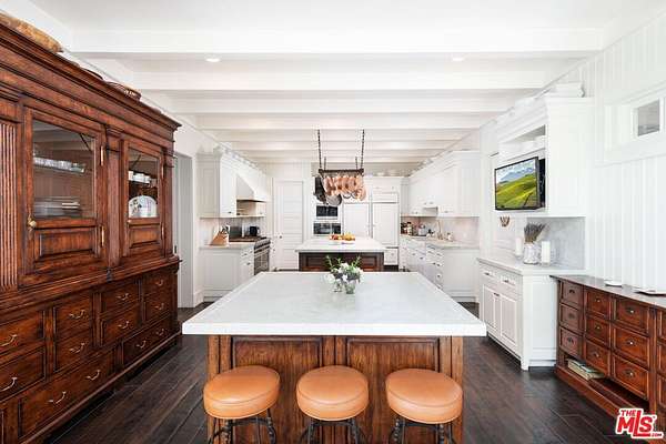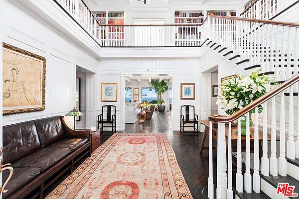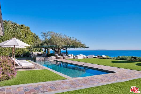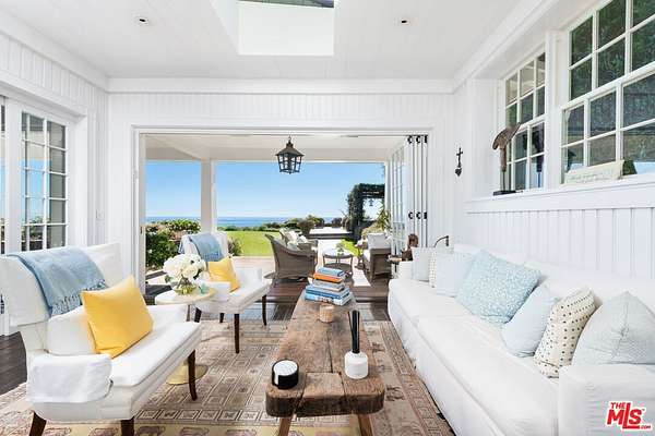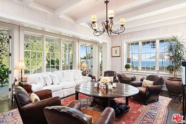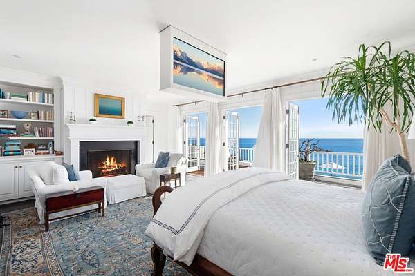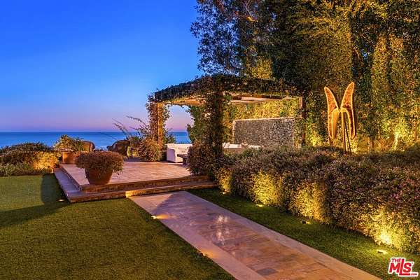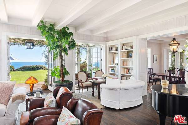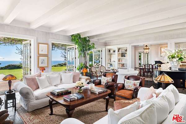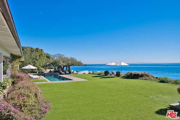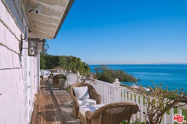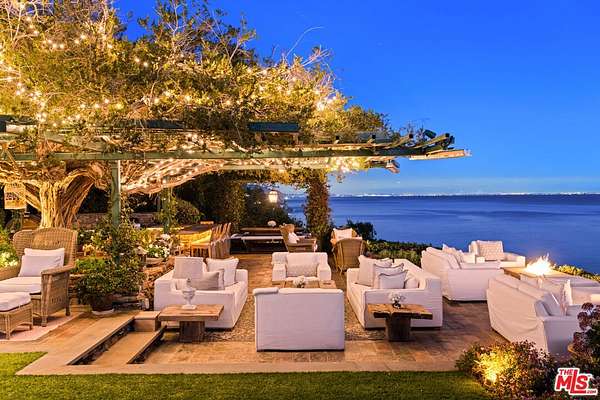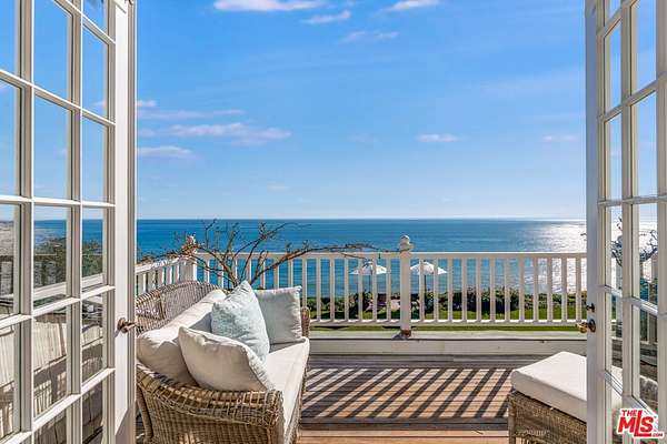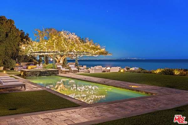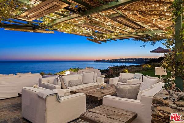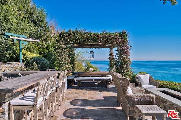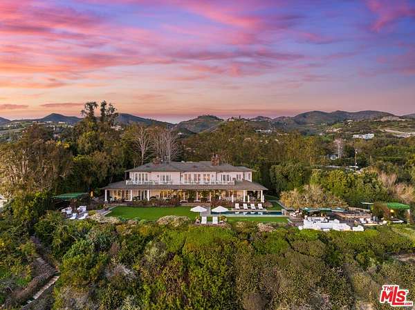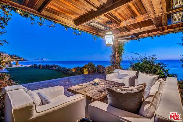 A perfect location, traditional elegance, and contemporary amenities add up to a truly luxurious lifestyle in this spacious, bluff-top Malibu compound. With entertainment industry cachet and sensational views, this ultra-private estate has been perfected for generous indoor-outdoor living and entertaining. At the end of a long, tree-lined drive, the 3-plus acre property comprises magnificent parklike grounds that command extravagant views from Point Dume to the Queen's Necklace, ocean, islands, and sunsets galore. Beautiful interior detailing includes high beamed and coffered ceilings, skylights, large windows, exquisite millwork and built-in cabinets, multiple fireplaces, wide plank hardwood floors, and numerous French doors that open onto expansive ocean-view decks and grounds. The floor plan is open, with easy flow and maximum views. A dramatic double-height foyer leads into the elegant living room, which opens to a deep-covered and heated poolside portico that stretches the full width of the house and offers ample space for lounging, dining, and entertaining. Off the living room is a bright, window-lined family room that extends into a gorgeous wood-wet bar. Also, open to the living room is the formal dining room, with another fireplace and table seating for ten guests. The country kitchen is a professional chef's dream, with two islands, a large pot hanger, Carrera marble countertops, bar seating, Viking, Wolf, and Miele appliances, a walk-in pantry, abundant cabinet space, and a charming breakfast area with a skylight and garden windows. The main floor also features a spacious recreation/game room with skylights and accordion doors to the backyard, an ocean-view office/sunroom with a built-in desk and doors opening onto the portico, plus a huge, two-tier screening room with comfortable couches. Completing the main floor are three en-suite bedrooms and two powder rooms. Upstairs, a fabulous wraparound library mezzanine overlooks the foyer. A hidden door leads to a living room/play area with a built-in desk and walls lined with shelves. Sliding doors reveal an en-suite office that could also serve as a bedroom. There are four beautiful en-suite bedrooms on this level, each opening onto a balcony, including the primary suite, which is a luxurious ocean-view getaway complete with fireplace, over-bed suspended TV, a lavish ocean-view bath, and multiple French doors onto the lounging deck outside. The estate's backyard provides expansive options for recreation and entertaining, with a huge, illuminated "giving tree" at its heart. Features include multiple seating areas, a waterfall swimming pool, Jacuzzi in a heated pergola, a hanging swing, fountains, extensive turf, a covered outdoor living room, and an outdoor kitchen complete with barbecue, pizza oven, counters with bar seating, and private steps leading to the wide sandy beach below. The property's many additional amenities include a double outdoor shower, a fully equipped security system, a security office, an optional on-site security team, a Sonos sound system, driveway parking for ten cars, and optional full-staff services. Extremely warm and welcoming, this classic estate is an achievement in elegance, comfort, and luxury.