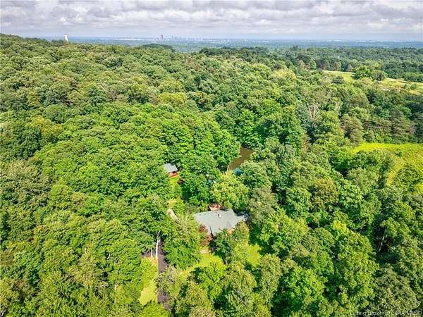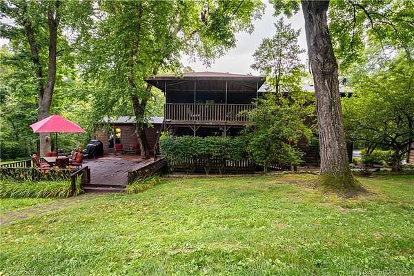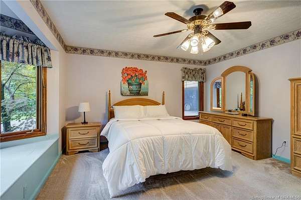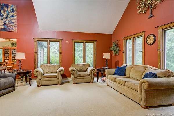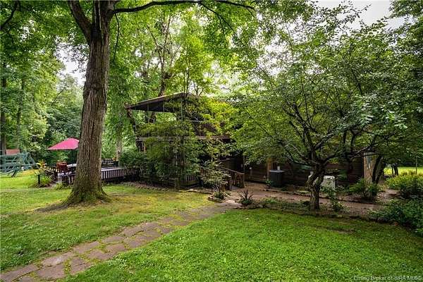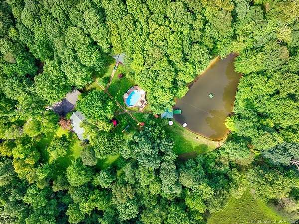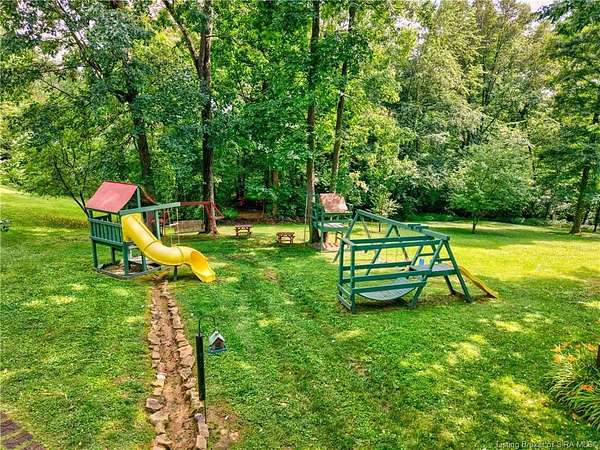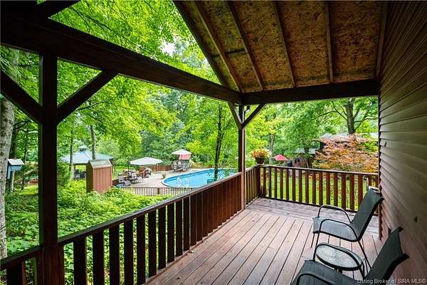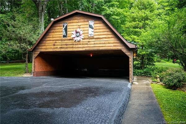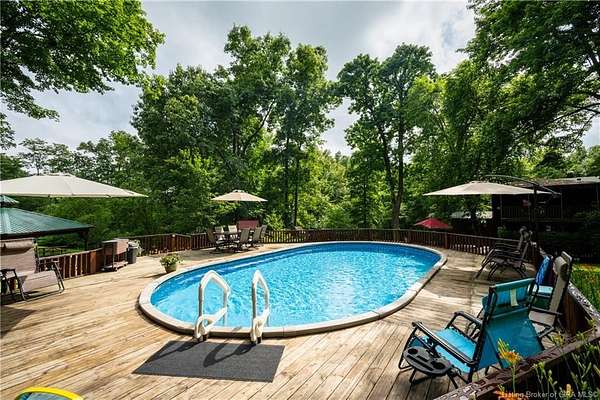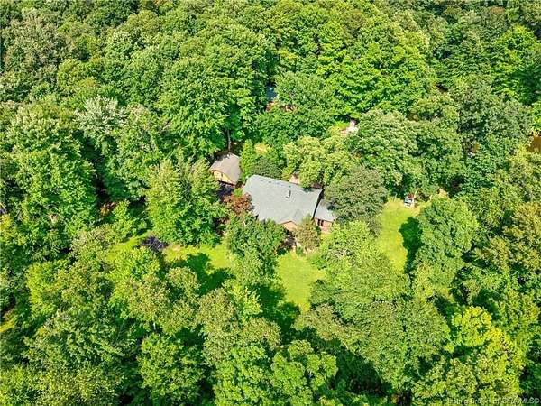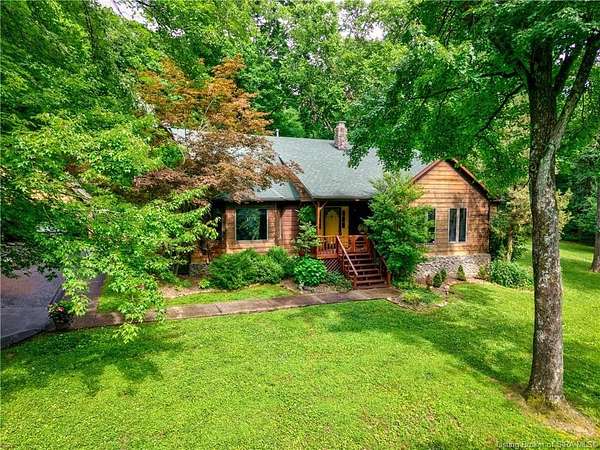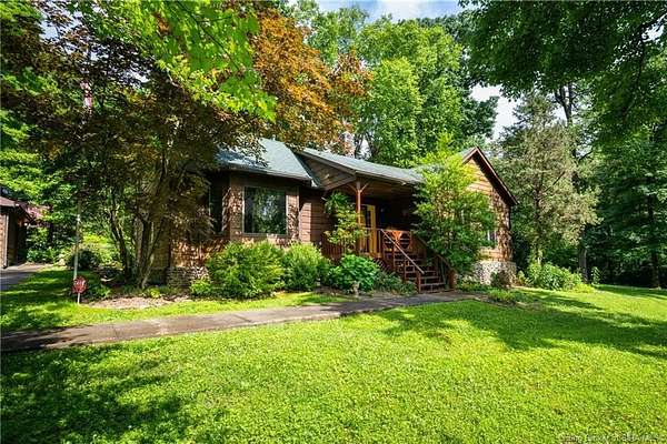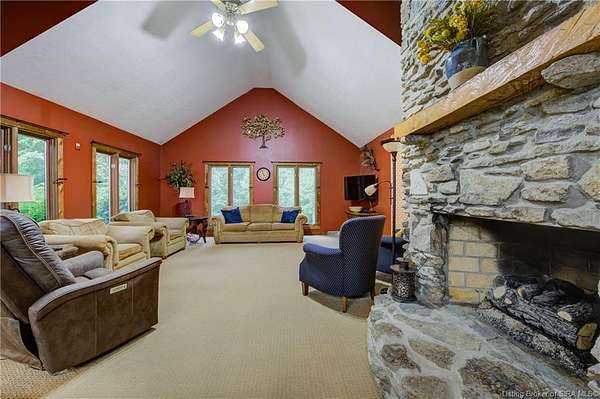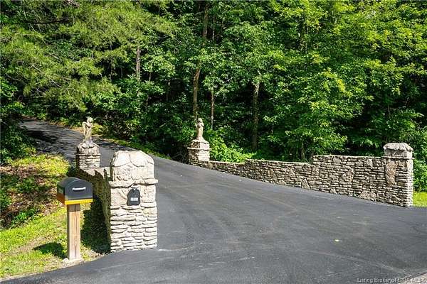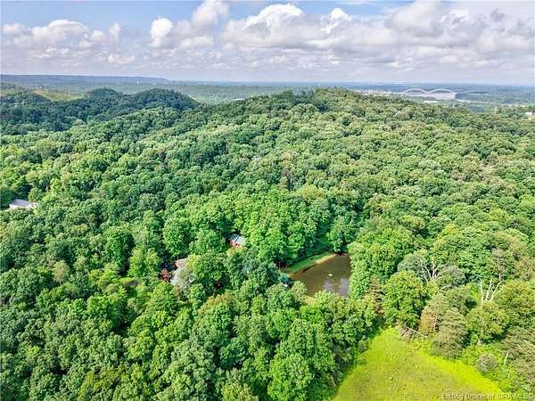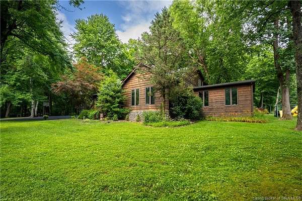 Tucked away on 8.83 +/- pristine wooded acres, two miles from Sherman Minton bridge, Angel Hill as it is affectionately known is a one-owner sanctuary surrounded by nature, yet close to everything. 1.5-story red cedar & creekstone home offers 2,797 square feet of thoughtfully designed living space w 3 bedrooms & 3.5 baths. The open floor plan effortlessly connects the kitchen, dining area, & family room, creating an inviting space for both daily living & entertaining. At the heart of the home, a striking creekstone fireplace adds warmth, charm, & rustic elegance. The primary suite is a peaceful retreat featuring a cozy window seat overlooking the scenic property, a full bath w double vanities, w an adjoining sitting/TV room. A versatile loft area provides flexible space for a home office, playroom, or reading nook, while two additional bedrooms, (2nd suite) & additional full bath comfortably accommodate family/guests. Outdoor living is where Angel Hill truly shines. Enjoy multiple decks w views of the surrounding woods, a pool, a 1/2-acre pond w zip line, Wooded Trails, 720 sq ft RecHut, 3 car garage & full house generator. BY APPOINTMENT ONLY . Sq ft & rm sz approx.