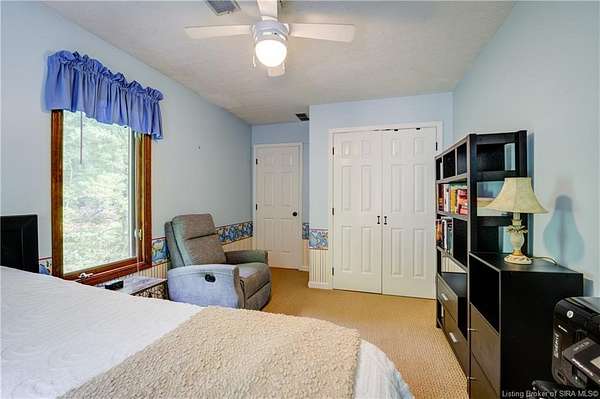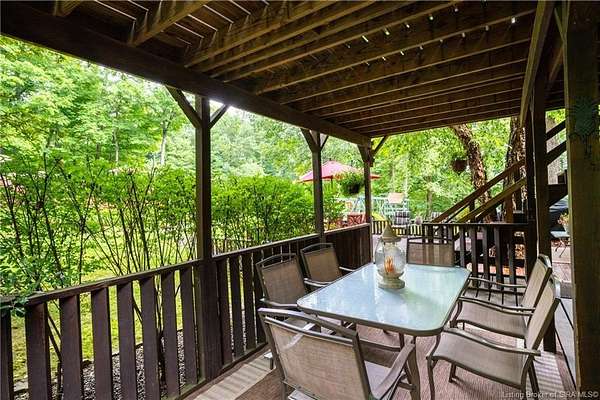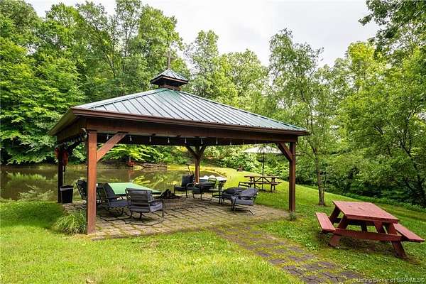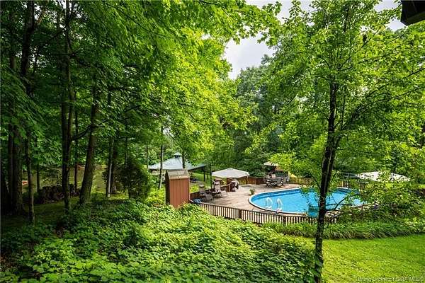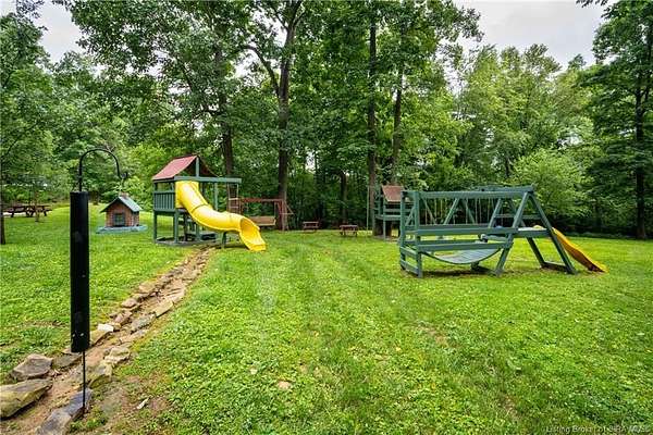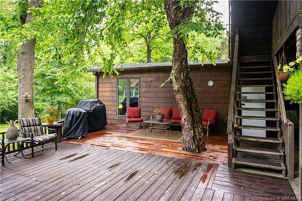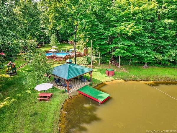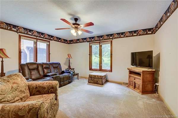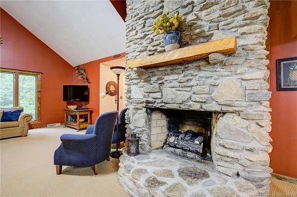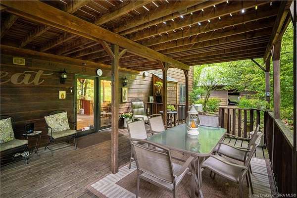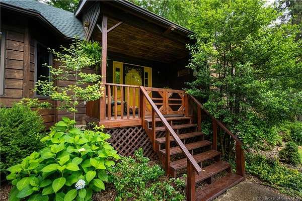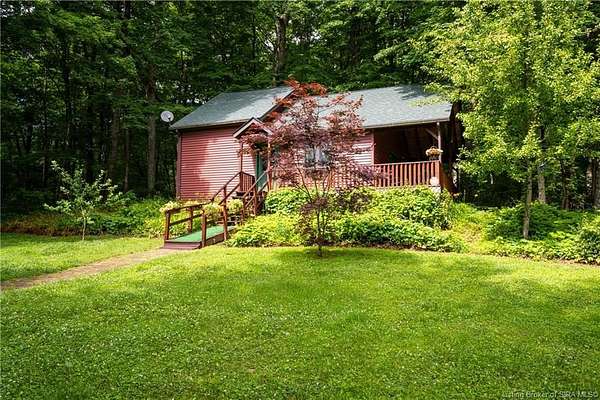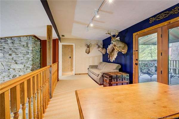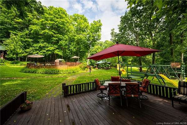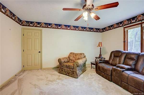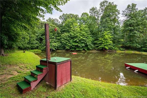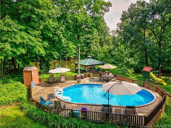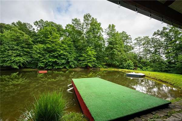 Tucked away on 8.83 +/- pristine wooded acres, two miles from Sherman Minton bridge, Angel Hill as it is affectionately known is a one-owner sanctuary surrounded by nature, yet close to everything. 1.5-story red cedar & creekstone home offers 2,797 square feet of thoughtfully designed living space w 3 bedrooms & 3.5 baths. The open floor plan effortlessly connects the kitchen, dining area, & family room, creating an inviting space for both daily living & entertaining. At the heart of the home, a striking creekstone fireplace adds warmth, charm, & rustic elegance. The primary suite is a peaceful retreat featuring a cozy window seat overlooking the scenic property, a full bath w double vanities, w an adjoining sitting/TV room. A versatile loft area provides flexible space for a home office, playroom, or reading nook, while two additional bedrooms, (2nd suite) & additional full bath comfortably accommodate family/guests. Outdoor living is where Angel Hill truly shines. Enjoy multiple decks w views of the surrounding woods, a pool, a 1/2-acre pond w zip line, Wooded Trails, 720 sq ft RecHut, 3 car garage & full house generator. BY APPOINTMENT ONLY . Sq ft & rm sz approx.