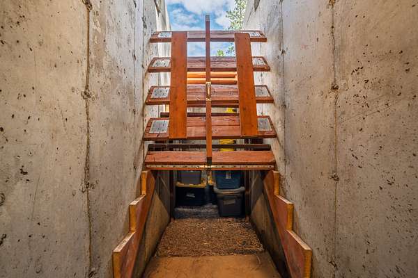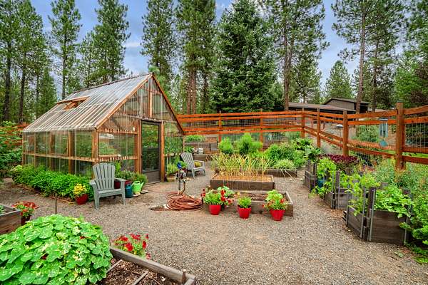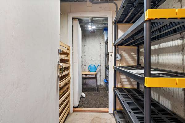 The beautifully landscaped yard with multi-levels, meandering paths and fantastic fall colors is a serene retreat that combines the natural beauty of the sloped yard. The terraced yard showcases an impressive collection of vibrant colors from the mature trees and bushes, creating a picturesque scene that invites exploration and appreciation of the natural world. The perennial pollinator plantings, complemented by more than 30 raised vegetable and fruit beds with a timer-operated irrigation system, offer a harmonious blend of beauty and sustainability. A productive fruit orchard and greenhouse enhance the property, while established raspberries, blackberries, blueberries, strawberries, apple trees, gooseberry bushes, a perennial herb garden, asparagus, and a thriving rhubarb patch complete this thoughtfully curated landscape. A poured-concrete root cellar with concrete walls and roof offers exceptional food storage, featuring two separately lighted rooms with ventilation for proper airflow, along with additional storage tucked behind the stairs.