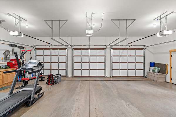 Five-car garage, with three bays featuring heated floors and integrated drainage
