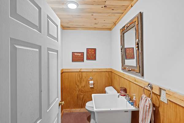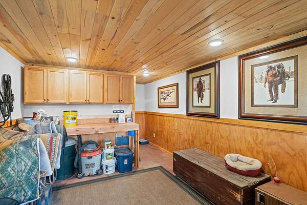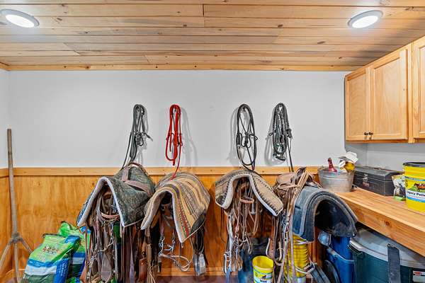 Heated tack room with concrete flooring, tongue-and-groove pine walls and ceiling, wooden workbench, upper storage cabinetry, and a half bathroom