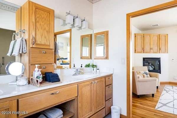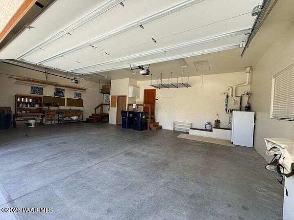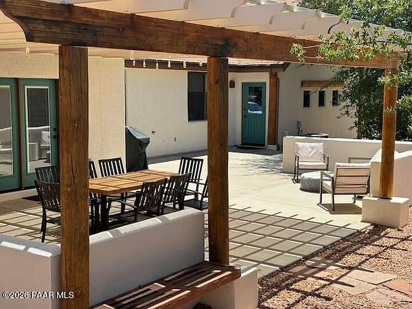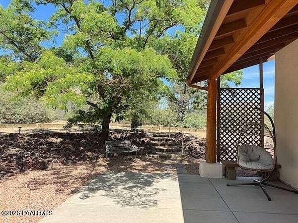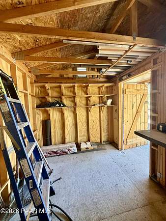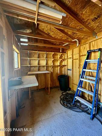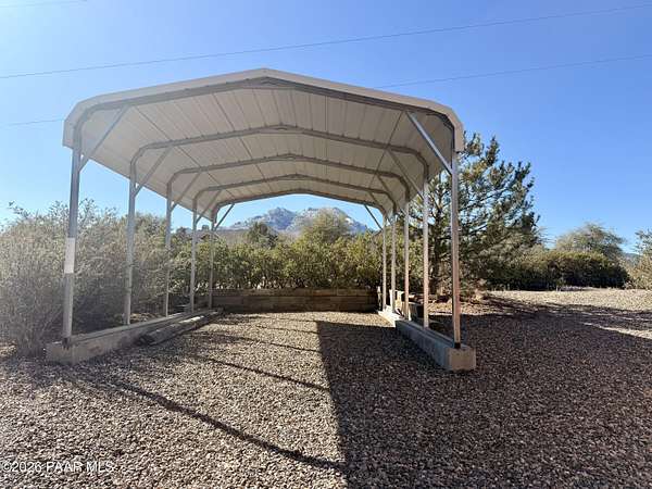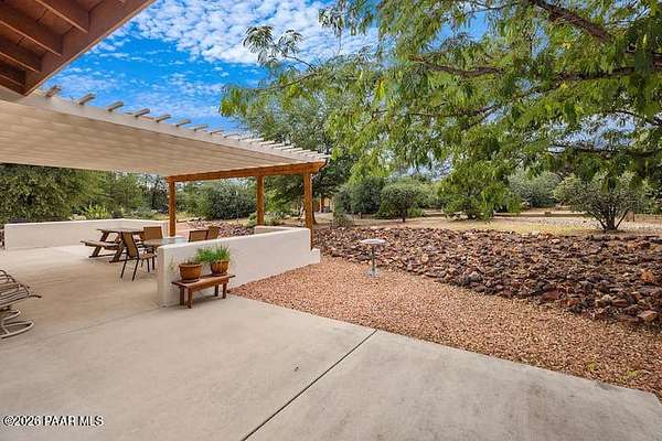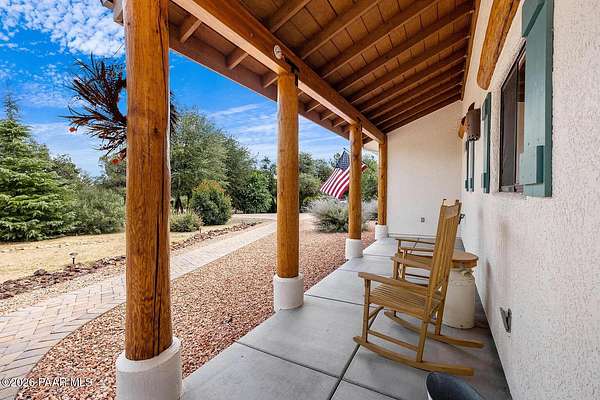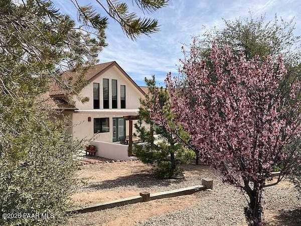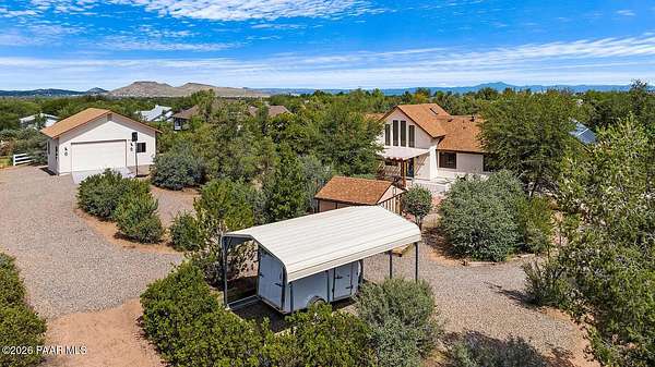 With a gorgeous backdrop of Granite Mountain, this Prescott home sits beautifully on 1.59 acres, surrounded by mature trees and established shrubs. The attractive paver driveway installed in 2020 is the perfect accent to this well maintained home that was freshly painted in 2021. A New roof that includes a transferrable warranty was installed in 2022, and the leased Solar has kept the electricity bill right around $30 a month and is prepaid util 2031! The oversized 3 car attached garage includes a new utilitly sink, 1/2 bath, and attic space. An additional detached and insulated 2 car garage/workshop that is 28'X28'' is located on the back of the property and includes 240V, a floor drain, and is wired for sound. Bonus outbuildings include a large 8X12' shed and a trailer shelter/carport that measures 14X21'. Inside this ''one level living'' home you will find an expansive, open-concept living area with vaulted ceilings and lots of windows for natural light, along with a handsome, river rock gas fireplace and natural wood timber posts that add a rustic charm to the space. A new stainless dishwasher was installed in the kitchen in 2025, and beautiful hickory cabinets add a rich warmth, while Roman shades throughout the home provide a softness to each room. The spacious primary bedroom includes a gas fireplace, sliders that lead to a private patio, an ensuite bathroom with double sinks, and a large, walk-in closet with ample shelving and cabinets. There are two additional bedrooms on the main level with good sized closets, one that includes a built in desk with cabinets, and an additional full guest bath. The laundry room is centrally located and includes cabinets and a sink, and the home has a tankless, recirculating hot water heater. A timber post railing accents the spacious loft that provides the perfect space for a family room, home gym, office, game or guest room!The private and peaceful setting of this property can be enjoyed outside on the expansive patio area that includes a seasonally covered pergola and fire pit with seating area. Horses are welcome here with lots of open land for setting up turnouts, or potentially converting the workshop into stables, with many trails nearby. All of this in a wonderful, Prescott neighborhood located only 10 miles from downtown!