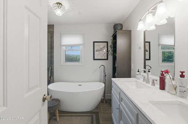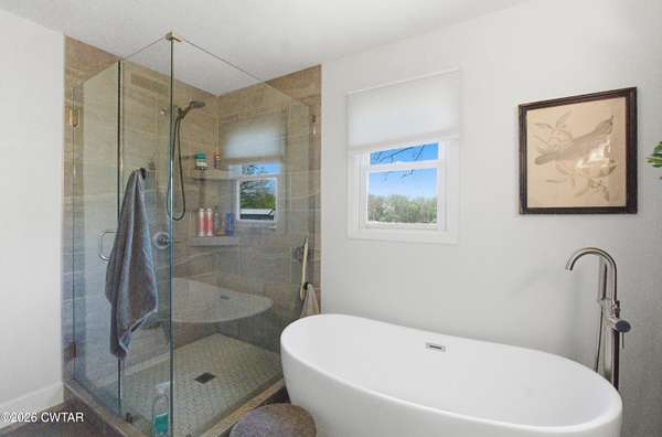 - Breakfast Bar, Ceramic Tile Shower, Double Vanity, Eat-In Kitchen, Pantry, Primary Downstairs, Soaking Tub, Walk-In Closet(s)
