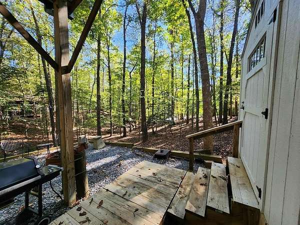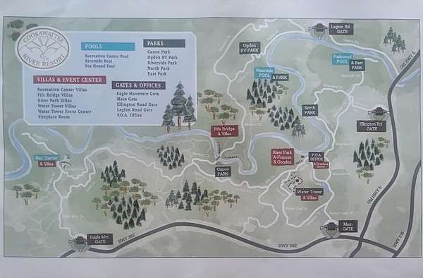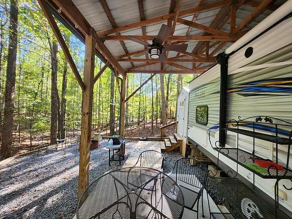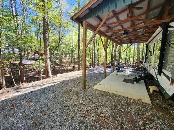 PRICED TO MOVE! Experience full-time or part-time mountain living in the highly sought-after Coosawattee River Resort with this turnkey garden retreat in the Georgia Mountains. Surrounded by lush, expansive green space, this property offers exceptional privacy and a tranquil natural setting. Outdoor living truly shines here with a large covered concrete patio, perfect for relaxing, entertaining, or grilling. The well-built roof-over provides covered parking and is bordered by a sturdy retaining wall that enhances both landscaping and function. The storage building is connected and full of useful extras that will make your stay even more Glamping than just Camping! Located within walking distance of the Riverside complex, dog park, and pool, you'll also enjoy full access to all Coosawattee River Resort amenities, including river access, gated entrances, three pools (one indoor), tennis and basketball courts, mini golf, parks, pavilions, and scenic walking trails. All this, in the heart of Georgia's wine country—surrounded by local wineries, charming eateries, antique shops, and endless hiking and biking adventures. THIS LISTING PRICE IS FOR RV LOT W/OUT THE TRAILER