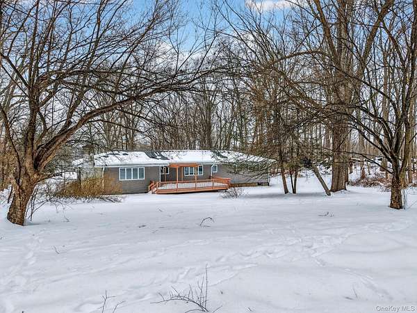 Set on 6.4 private, wooded acres, this beautifully maintained 3-bedroom, 2.1-bath ranch offers the ease of one-level living with exceptional space and privacy. A welcoming entry foyer leads to a spacious living room and formal dining room, ideal for everyday living and entertaining. The updated kitchen features granite countertops, custom cabinetry, peninsula seating, and a bright dining area. The kitchen opens seamlessly to the expansive family room accented with soaring cathedral beamed ceilings, a dramatic floor-to-ceiling stone fireplace, and sliding glass doors to an oversized deck-creating the perfect space for gatherings. An updated full bathroom is conveniently located off the family room. The oversized primary suite offers a custom bath complete with a soaking tub, separate shower, and radiant heat flooring. Two additional generously sized bedrooms and a powder room on the main level. A laundry room with access to the two-car garage and full, unfinished basement provides excellent storage. Enjoy outdoor living on the large deck overlooking the peaceful wooded backyard or relax on the inviting front patio. Featuring vinyl siding with brick accents, central air, and set well off the road for privacy, yet close to highways and shopping. This move-in ready home is ready for its new owners.