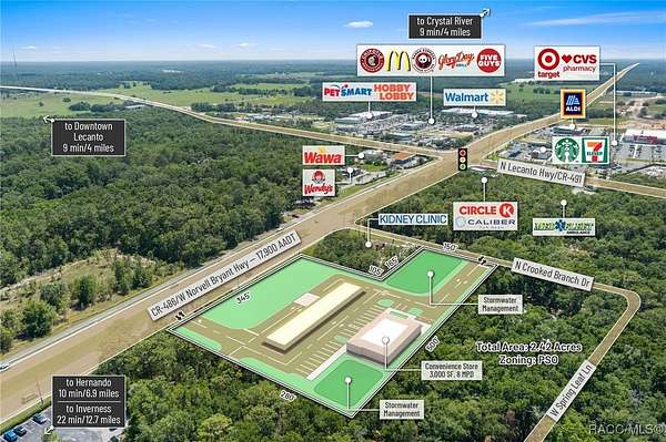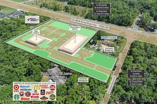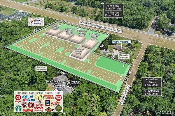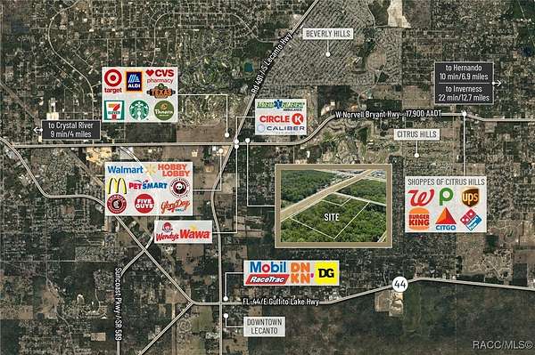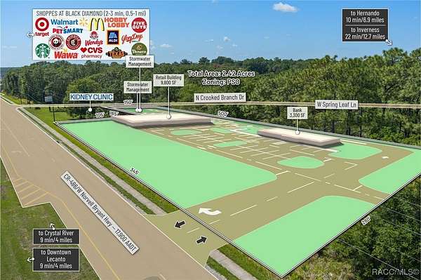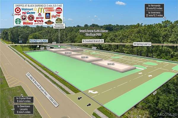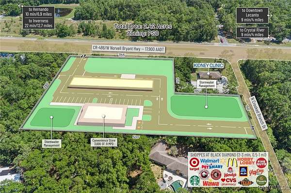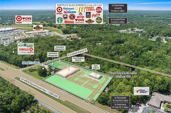 This highly strategic 2.43-acre assemblage presents a rare multi-parcel development opportunity at the northeast corner of E Norvell Bryant Hwy (CR 486) and Crooked Branch Drive, directly across from Citrus County's most active commercial expansion zone. Offering over 352 feet of prime frontage along CR 486, the site boasts dual road exposure and wraps the intersection with full median-cut access, ensuring seamless ingress and egress along one of the county's most visible corridors. E Norvell Bryant Hwy supports an Annual Average Daily Traffic (AADT) of approximately 22,000 vehicles, making it one of the highest-trafficked arteries in the region-ideal for high-exposure commercial, medical, or mixed-use development. The property features gently rolling terrain with elevations ranging from 76 to 103 feet and well-drained Arredondo fine sand soils, with average slopes of 7-16%. Situated entirely within Flood Zone X, it poses no floodplain development restrictions and offers favorable drainage conditions, reducing site preparation costs and simplifying the grading process. County water is available at the frontage, while sewer service is accessible nearby within the utility district, subject to standard connection and assessment approvals. The dual-corner configuration, combined with clean topography, allows for exceptional design flexibility-accommodating multiple building pads, ample parking, and efficient circulation patterns. Located just two parcels east of the signalized intersection of CR 486 and CR 491, the site is surrounded by top-tier national retailers, including Walmart, Target, ALDI, Panera Bread, and Texas Roadhouse-positioning it at the heart of Citrus County's most dynamic medical and retail corridor. Located in the heart of Citrus County's Central Ridge, this property serves 66,000+ residents within 5 miles, with a median age of 60 and household income exceeding $65,000.