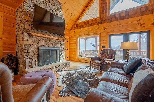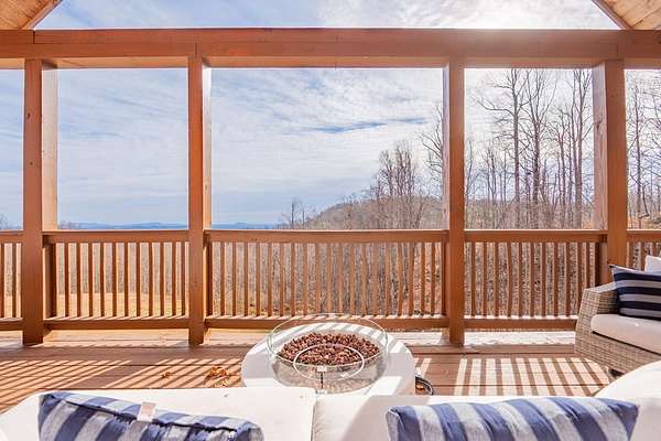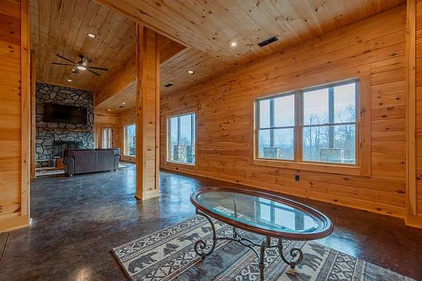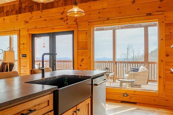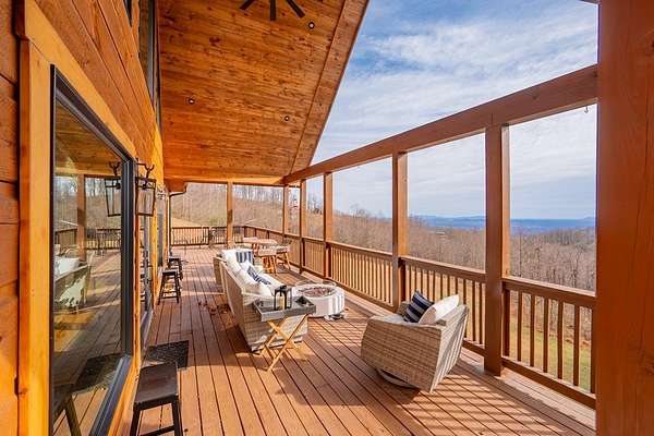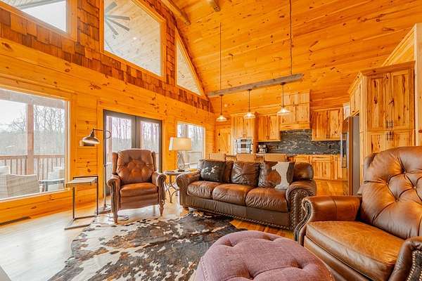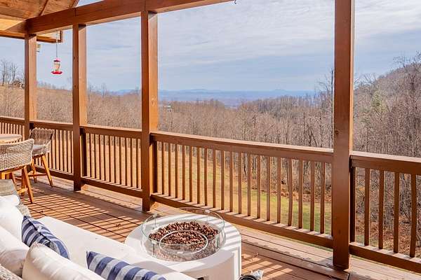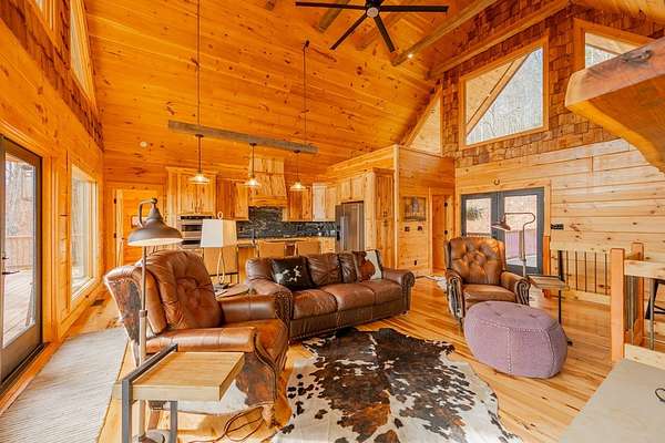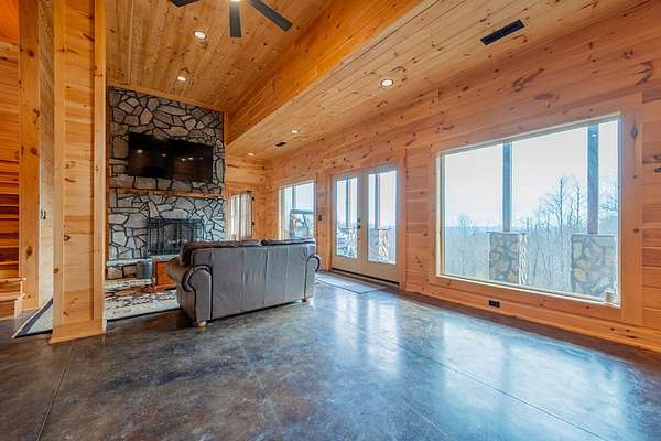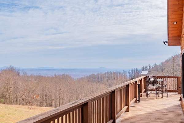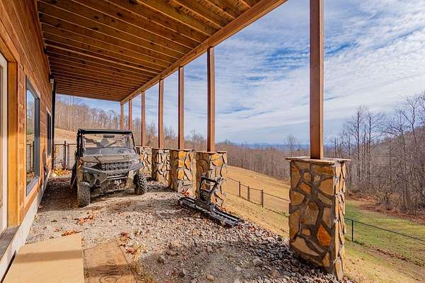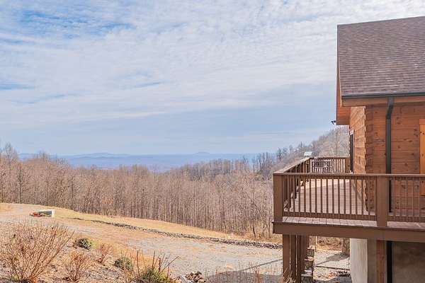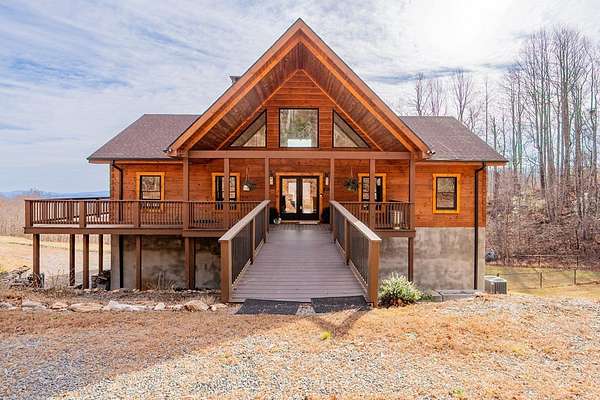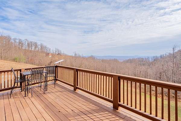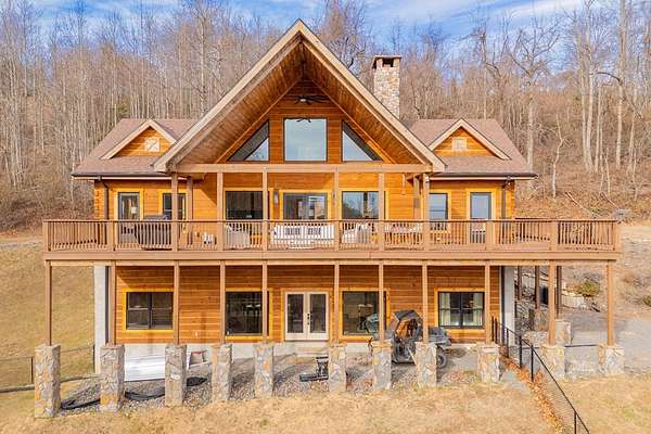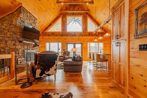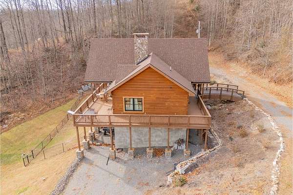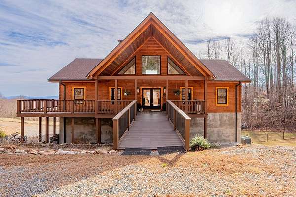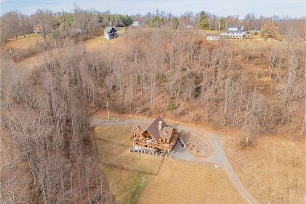 Blue Ridge Parkway Masterpiece on 4.636 acres with complete end-of-road privacy. This luxury Southland Log Home in Fancy Gap offers breathtaking 60-mile views of the Piedmont, including Pilot Mountain, Hanging Rock, and the Winston-Salem skyline. Situated on two combined lots totaling 4.636 acres, the property now includes a fenced backyard and expanded usable space, about 1.5 acres of open land surrounded by a border of woods to protect your privacy. The home is fully furnished with few exceptions and showcases exceptional craftsmanship throughout. Features include hand-built hickory cabinetry by Brushy Mountain Enterprises in the kitchen and upper baths, leathered granite countertops, under-cabinet lighting, and wide-plank hickory floors on the upper level. The great room offers 26' cathedral ceilings with old barn wood beams, cedar shake accents, an 8' Big Ass ceiling fan, and a stunning Bob Timberlake stone wood-burning fireplace framed by floor-to-ceiling windows that capture the panoramic views. A custom arched bridge spans a peaceful water feature at the entry. The home offers three spacious en suite bedrooms-two on the main level and one on the lower level-all with large walk-in closets, plus an upstairs half-bath. The expansive lower level includes 13'-14' ceilings, a second stone fireplace, a custom bar, and an open layout ideal for entertaining. Enjoy year-round outdoor living on the covered decks at both the view side and the entry. Additional features include KitchenAid induction cooktop, wall oven/microwave, refrigerator, LG WashTower laundry center, custom lighting throughout, two heat pumps, a natural spring on the property, and a fenced backyard. Community has covenants and restrictions as well as a road maintenance agreement, with annual road maintenance fees of $100 per lot per year. This turnkey home offers unmatched craftsmanship, long-range views, and true end-of-road privacy along the Blue Ridge Parkway.