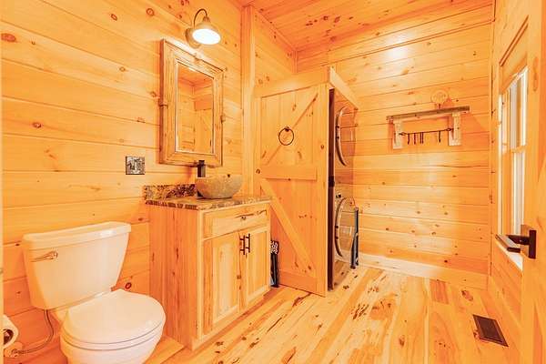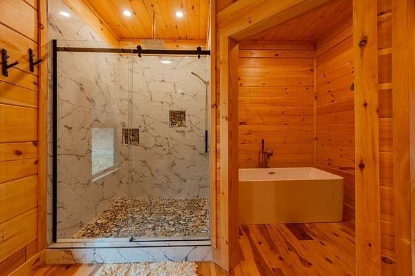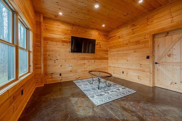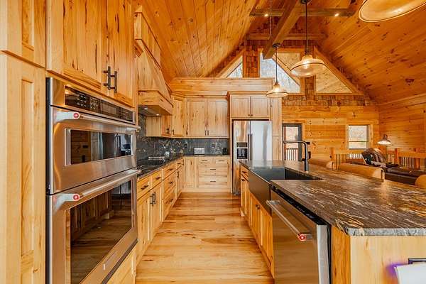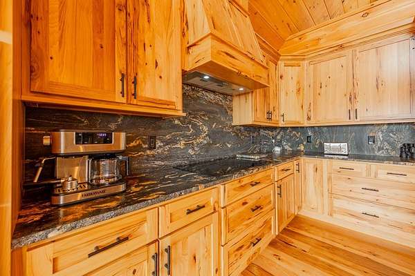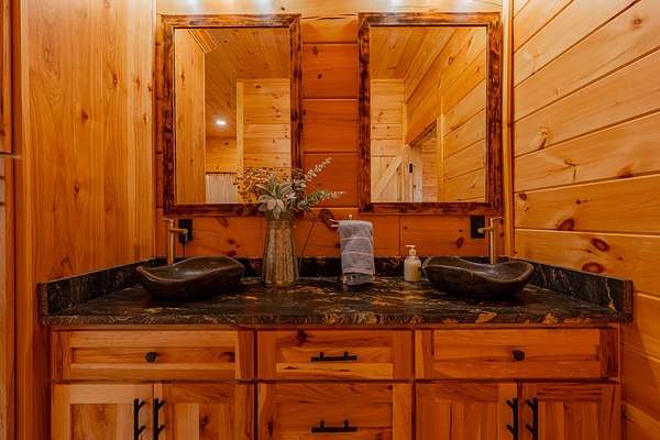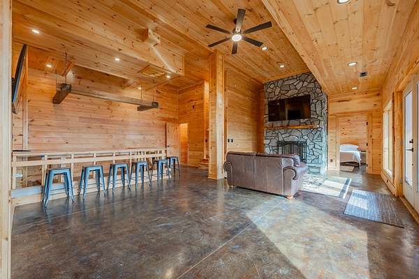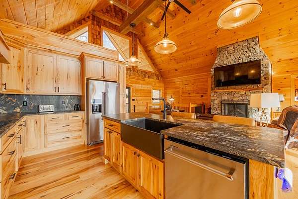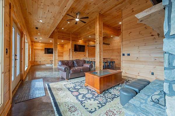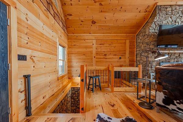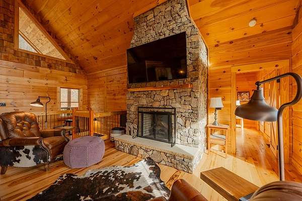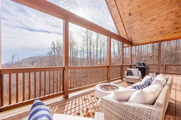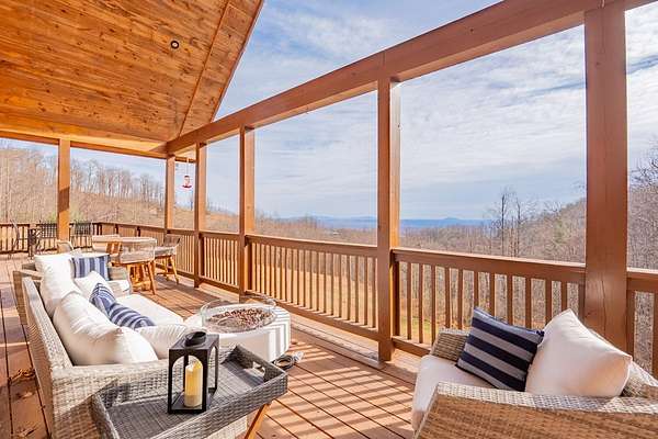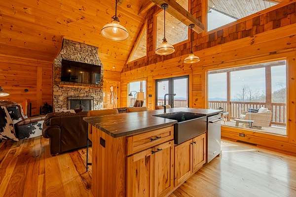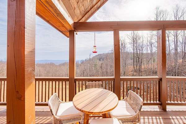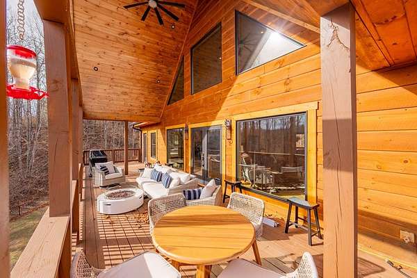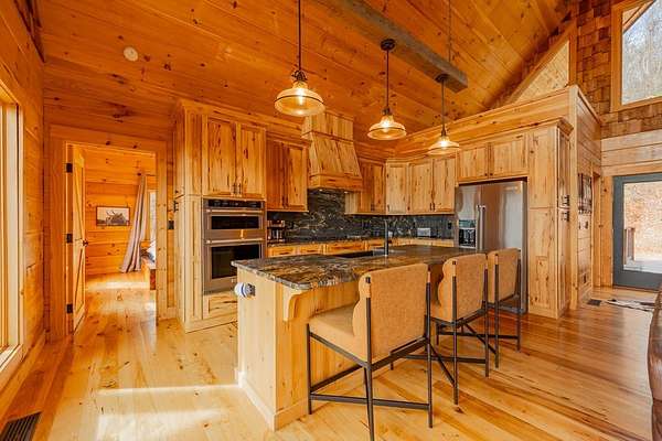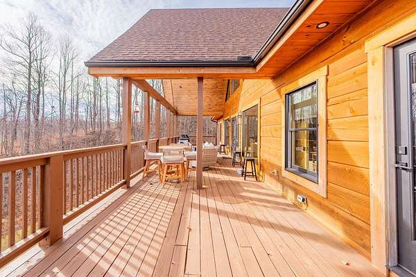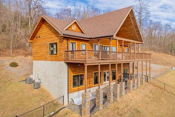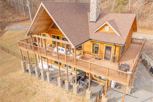 Blue Ridge Parkway Masterpiece on 4.636 acres with complete end-of-road privacy. This luxury Southland Log Home in Fancy Gap offers breathtaking 60-mile views of the Piedmont, including Pilot Mountain, Hanging Rock, and the Winston-Salem skyline. Situated on two combined lots totaling 4.636 acres, the property now includes a fenced backyard and expanded usable space, about 1.5 acres of open land surrounded by a border of woods to protect your privacy. The home is fully furnished with few exceptions and showcases exceptional craftsmanship throughout. Features include hand-built hickory cabinetry by Brushy Mountain Enterprises in the kitchen and upper baths, leathered granite countertops, under-cabinet lighting, and wide-plank hickory floors on the upper level. The great room offers 26' cathedral ceilings with old barn wood beams, cedar shake accents, an 8' Big Ass ceiling fan, and a stunning Bob Timberlake stone wood-burning fireplace framed by floor-to-ceiling windows that capture the panoramic views. A custom arched bridge spans a peaceful water feature at the entry. The home offers three spacious en suite bedrooms-two on the main level and one on the lower level-all with large walk-in closets, plus an upstairs half-bath. The expansive lower level includes 13'-14' ceilings, a second stone fireplace, a custom bar, and an open layout ideal for entertaining. Enjoy year-round outdoor living on the covered decks at both the view side and the entry. Additional features include KitchenAid induction cooktop, wall oven/microwave, refrigerator, LG WashTower laundry center, custom lighting throughout, two heat pumps, a natural spring on the property, and a fenced backyard. Community has covenants and restrictions as well as a road maintenance agreement, with annual road maintenance fees of $100 per lot per year. This turnkey home offers unmatched craftsmanship, long-range views, and true end-of-road privacy along the Blue Ridge Parkway.