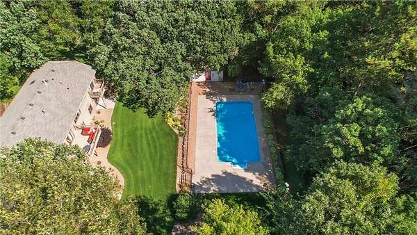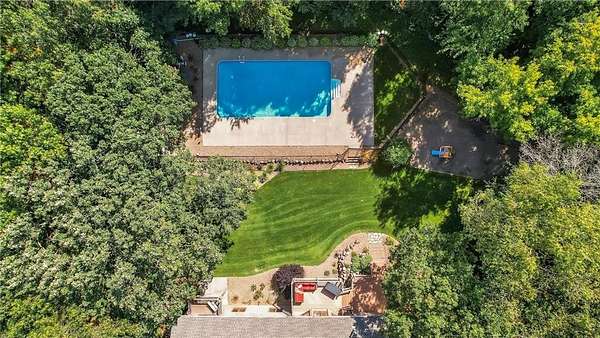 Also on the main level, you'll find two bedrooms with new carpet. One is a suite with a 3/4 bath, a walk-in closet with custom organization, and a private balcony. The second bedroom enjoys a walk-through full bath. The walk-out lower level was designed for entertaining, with a gas fireplace, wet bar, office nook, and another suite bedroom with a 3/4 bathroom attached. The lower level also includes two spacious storage rooms. Outside, the amenities shine! A heated attached 2 stall garage, in-ground sprinkler system, a maintenance-free deck, a 20x40 in-ground pool with full fencing, and a 12x20 pool shed. A separate private driveway leads you to a 30x30 detached shed heated by a wood burner, which offers 100-amp power and brand-new 8-foot garage doors with openers. Perfect for hobbies, storage, or a workshop. Follow the wooded path to a private fire pit area with a one-of-a-kind grain bin gazebo, complete with power, ideal for movie nights or football games under the stars. The house, pool shed, and shop all have 3-year-old roofs.