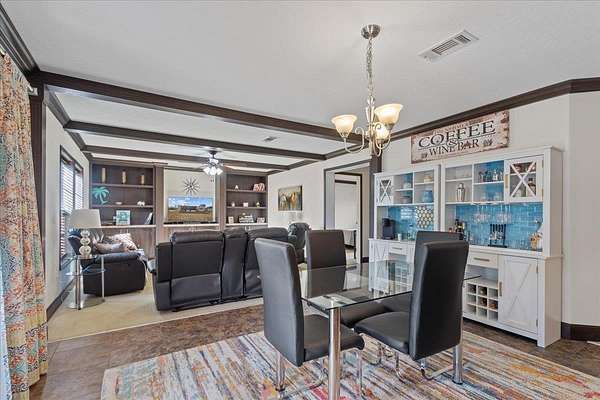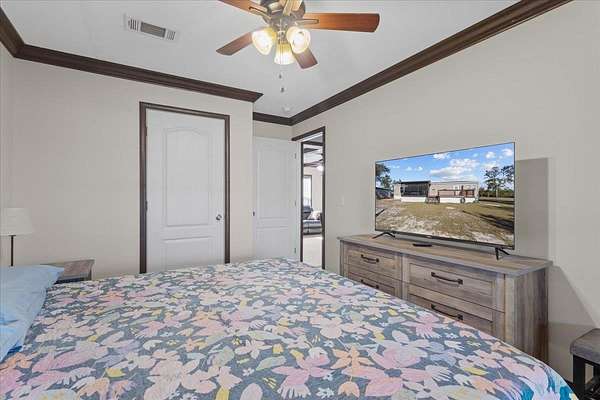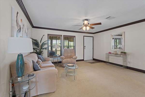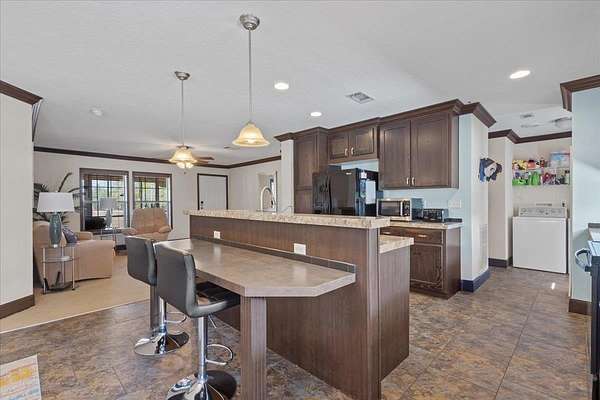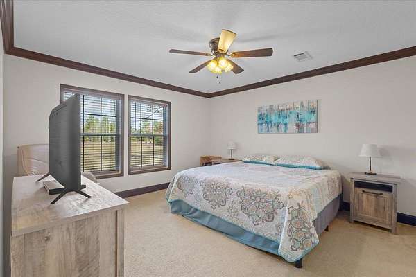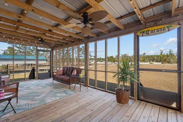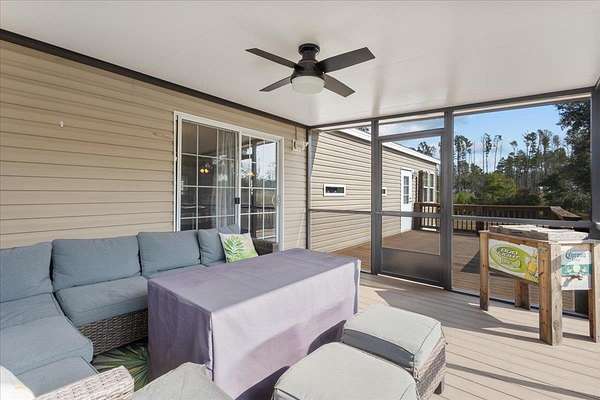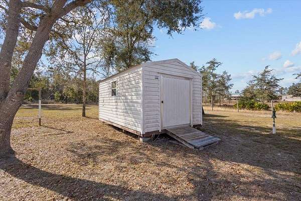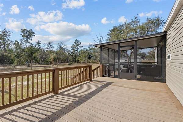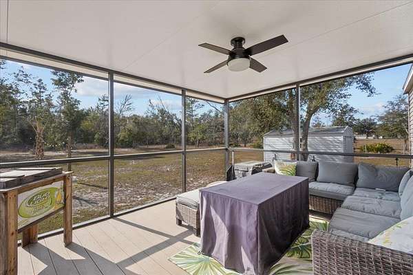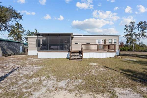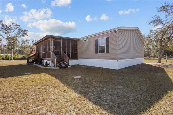 Tucked away on 2 peaceful acres, this 2016-built home offers the kind of quiet living where deer wander through the yard and evenings are best spent outdoors. A palm tree-lined driveway welcomes you home, setting the tone for a property that feels private, relaxed, and thoughtfully maintained. Inside, the open floor plan balances connection and comfort, with a more private family room and a split-bedroom design that provides added privacy. The primary suite is a true retreat, featuring a walk-in closet, double sinks, a tiled shower, and a deep garden tub made for unwinding at the end of the day. The spacious kitchen offers ample counter and cabinet space, matching appliances, and a central island that easily serves as a breakfast spot, work desk, or homework station. Major updates add peace of mind, including a newer roof, newer HVAC system, and recently replaced under-skirting tie-downs. Outdoor living truly shines here. The covered, screened front porch is ideal for year-round enjoyment, while the back deck-half screened and half open-features durable composite decking built to last. Just beyond, a cozy fire pit oasis creates an inviting space for evenings under the stars. The yard is low-maintenance with minimal trees, yet the backyard remains nicely private. Storage and functionality abound with a large garage complete with built-in shelving and a tool bench, a 2-car metal carport, and an additional storage shed with electric-perfect for converting into an office, craft room, playroom, or climate-controlled storage. A water softener and filtration system adds extra convenience. Located just 10 minutes from the Gulf of Mexico and surrounded by multiple state and WMA lands for hunting and exploring, this property offers the perfect blend of peaceful living and outdoor adventure. Photos of the inside of the garage coming soon.