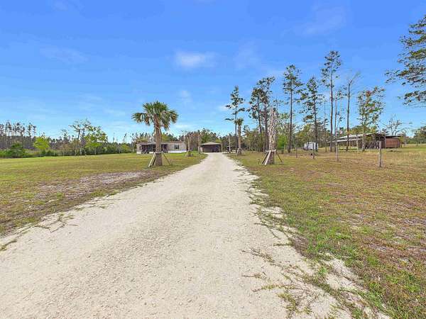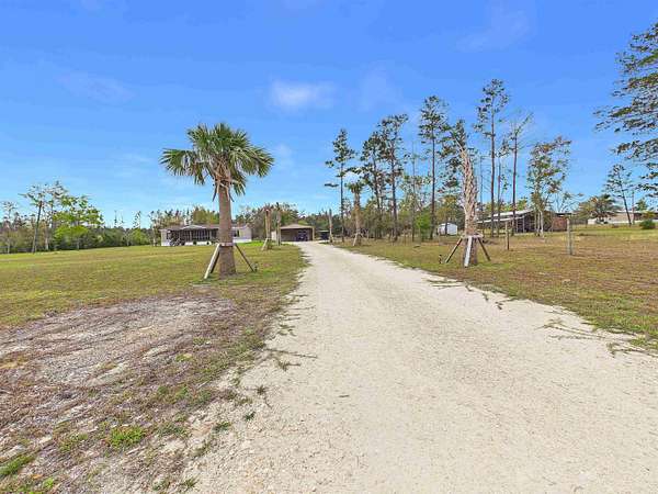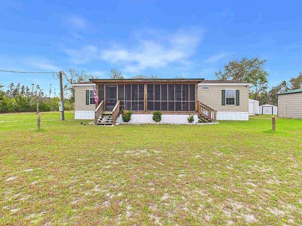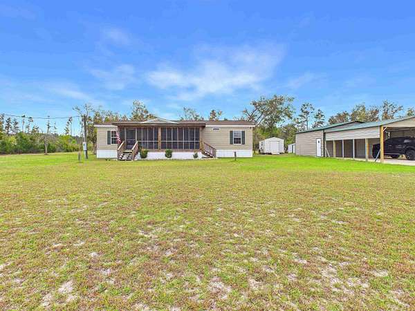 One or more photos virtually enhanced with twilight effect. Tucked away on 2 peaceful acres, this 2016-built home offers the kind of quiet living where deer wander through the yard and evenings are best spent outdoors. A palm tree-lined driveway welcomes you home, setting the tone for a property that feels private, relaxed, and thoughtfully maintained. Inside, the open floor plan balances connection and comfort, with a more private family room and a split-bedroom design that provides added privacy. The primary suite is a true retreat, featuring a walk-in closet, double sinks, a tiled shower, and a deep garden tub made for unwinding at the end of the day. The spacious kitchen offers ample counter and storage space, matching appliances, and a central island that easily serves as a breakfast spot, work desk, or homework station. Major updates add peace of mind, including a newer roof, newer HVAC system, and recently replaced under-skirting tie-downs. Outdoor living truly shines here. The covered, screened front porch is ideal for year-round enjoyment, while the back deck-half screened and half open-features durable composite decking built to last. Just beyond, a cozy fire pit oasis creates an inviting space for evenings under the stars. The yard is low-maintenance with minimal trees, yet the backyard remains nicely private. Storage and functionality abound with a large garage complete with built-in shelving and a tool bench, a 2-car metal carport, and an additional storage shed with electric-perfect for converting into an office, craft room, playroom, or climate-controlled storage. A water softener and filtration system adds extra convenience. This property is easily financeable with FHA, Conventional, or VA financing and is fully insurable-no flood zone and no flood insurance required. Located just 10 minutes from the Gulf of Mexico and surrounded by multiple state and WMA lands for hunting and exploring, this property offers the perfect blend of peaceful living and outdoor adventure.
