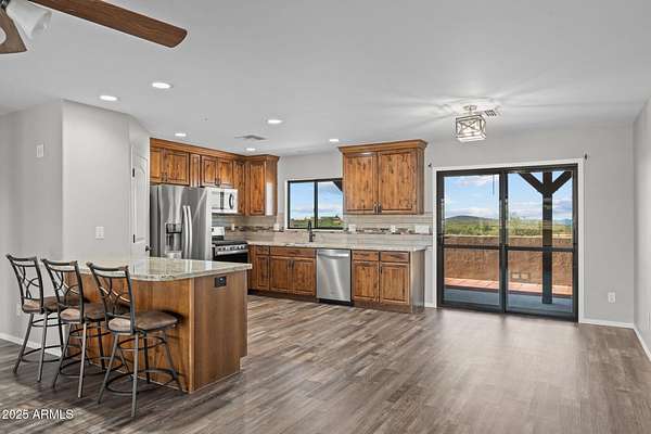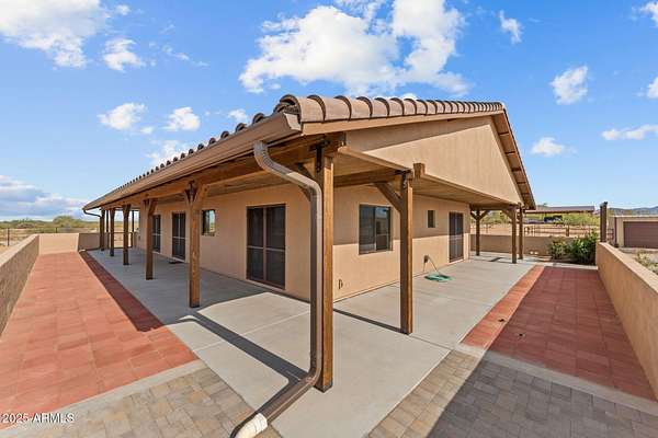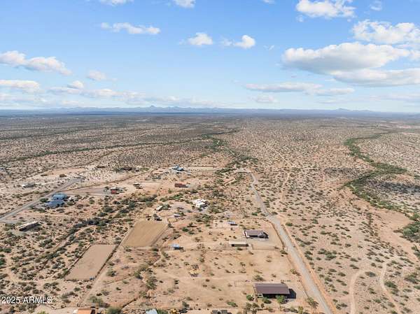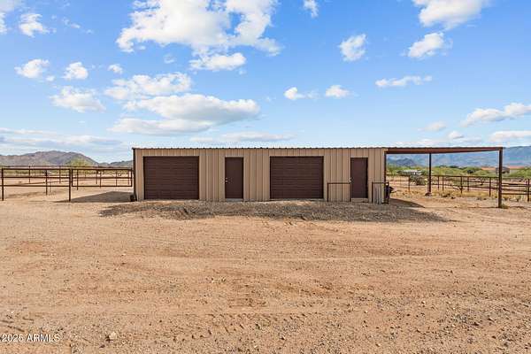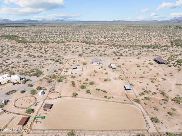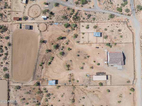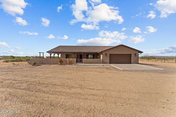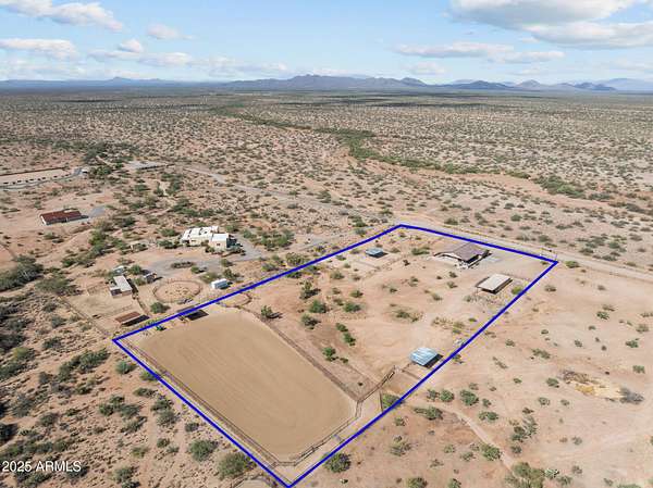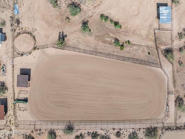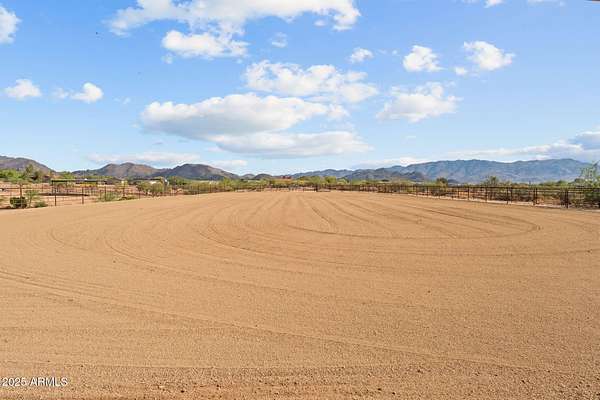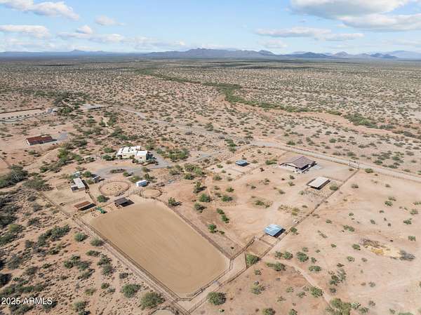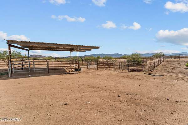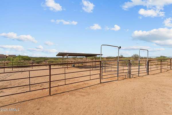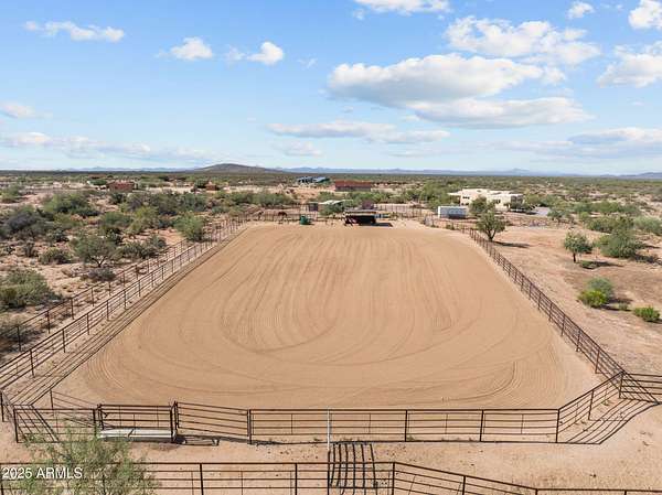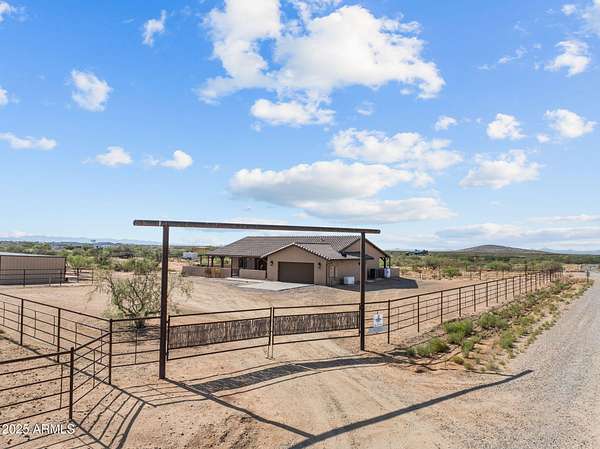 First horse property in this exclusive area of custom homes on the market. Can't say enough about this 4 acre parcel all pipe fenced and set up by a Wyoming Cowboy. The lay out was well thought out for hours of team roping, location of holding pens, turnouts for visiting guest, round pen to tune up the colts and taking advantage of the Bradshaw Mountains. The home and entertaining area was custom built by RL Brim bringing his standard building exceptualism. Sprayed foam insulation throughout including interior walls, high end gas stove, refrigerator, built in microwave, dishwasher with walk in pantry and beautiful cabinets in the kitchen The kitchen opens up to a dining area to accommodate large family gatherings and for coffee with a neighbor the breakfast bar comes in handy. The split floor plan gives privacy to the master suite with walk in closet and full dbl sink in bathroom. Walk out exit to star gaze at night on the wrap around covered patio. Laundry room has easy access from this bedroom and owner is leaving energy efficient washer and dryer. Guest bedrooms are separated by the guest bath and each have access to the outdoors. Owner invested in the popular Prestige Security Screen doors and installed on every entrance giving this home another Value added to your investment. 2025 Generac backup system to insure the power stays on during monsoon season is included in sale. This is one of five residence that share the mountain views, close proximity to State Land, private road, Congress Water and no HOA. Home was painted inside and out and professionally cleaned July 2025 for the new buyer. It is move in ready!