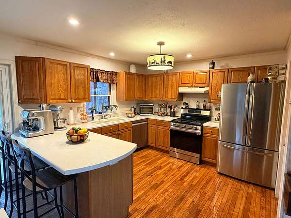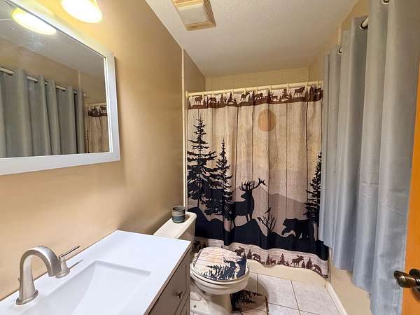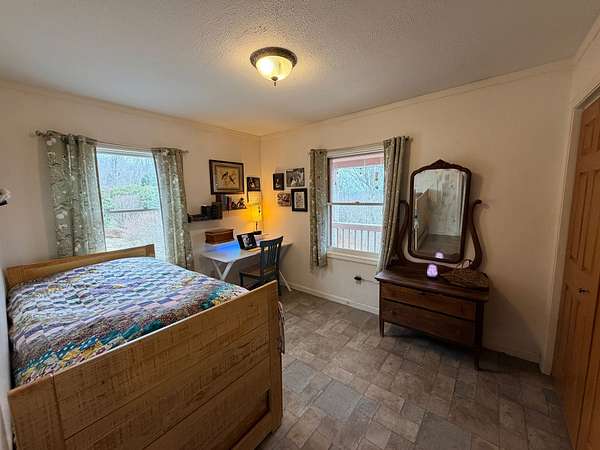 The lower apartment provides a comfortable one-bedroom, one-bathroom living space with a tiled great room that includes kitchen, dining, and living areas. An additional den or family room, currently used as a private gym, adds flexibility, while a large laundry room offers ample storage. Mini-split systems ensure year-round comfort, complemented by an additional wood stove for warmth & charm during the colder months.