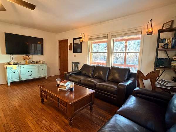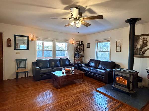 The home itself is a rare find, luxury off-grid living that is both elegant & practical. Designed as a multi-family residence or ideal mother-in-law suite, the house features 2 fully functioning apartments w/ separate entrances. The upper level offers 2 bedrooms, 2 bathrooms, & an additional office or den, all centered around an open great room that combines kitchen, dining, & living spaces. Hardwood, tile, & laminate flooring run throughout, while expansive windows frame breathtaking mountain views from the treetops. Recent updates include new stainless-steel appliances, updated kitchen plumbing, & modern lighting fixtures, all enhancing the home's warm, refined character. Gravity fed spring & propane hot water heater always ensure constant modern conveniences. A wood stove adds cozy ambiance for winter evenings spent with hot chocolate by the fire.