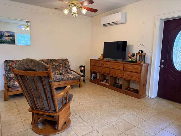 The lower apartment features a comfortable 1 bedroom, 1 bathroom living space with a tiled great room with kitchen, dining, and living areas. An additional family room, currently used as a private gym, adds flexibility, while a large laundry room offers abundant storage. Mini-split systems ensure year-round comfort, complemented by an additional wood stove for warmth & charm during the colder months.
