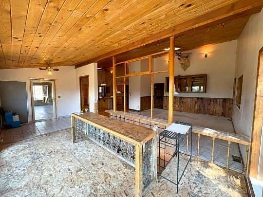 Mountain Sanctuary on 36.1 acres with unmatched Sangre de Cristo views! This unique home offers two bedrooms, one full and one 3/4 bath, and an abundance of artistic character throughout. Features include cathedral ceilings, custom built-ins, and an expansive front sitting area ideal for entertaining, a home gym, or office space. You'll also find a mudroom - pantry, and unfinished additions awaiting your vision. Outside, the land is rich with towering Ponderosa, Pinon, and Juniper, and includes a small greenhouse, artistic adobe wall, fire pit with seating area, two detached garages, a one-car attached garage, metal carport/tractor storage, and a lean-to with three horse stalls. This is a dream setting for creatives, equestrians, or investors with potential to subdivide into 5-acre parcels. Whether you finish the addition or embrace the home's rustic soul, you're investing in views, space, and freedom. Sold as-is, where-is, seller will make no repairs or concessions. A little bit of TLC on this one could land you the home of your dreams! The unfinished addition is just waiting for your finishing touches! Guest suite? Mother-in-law suite? Art studio? You decide!