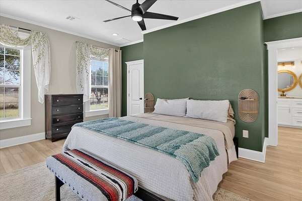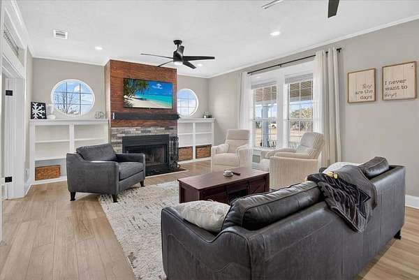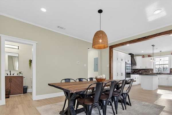 Built in 1950, this charming country home was thoughtfully remodeled from top to bottom into the move-in-ready property you see today. Sitting on 5.58 Acres with 2 original barns, & a 20' Connex container. Home has been completely updated including new doors, new roof installed in 2023, new ceilings, & new flooring throughout. Major system upgrades include a new HVAC system with updated ductwork, new electrical wiring to the hot water heater, HVAC, stove, and dryer, plus a new electrical panel and new wiring from the pole. 31 recessed lights, new ceiling fans & light fixtures throughout. Both bathrooms fully remodeled with new fixtures. The kitchen features custom cabinetry, new countertops, double oven and gas stovetop.