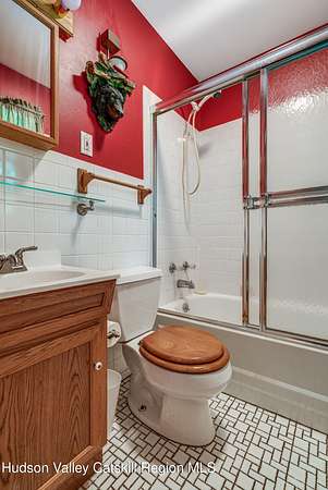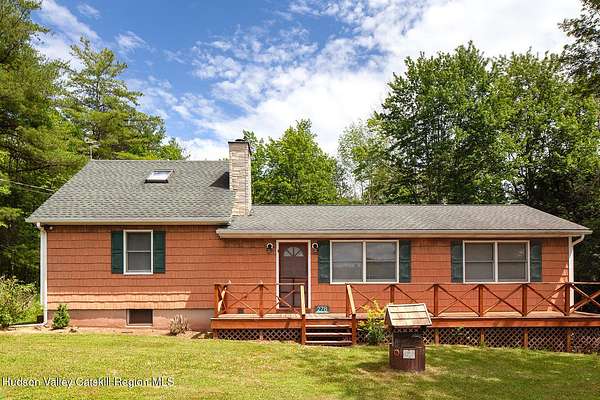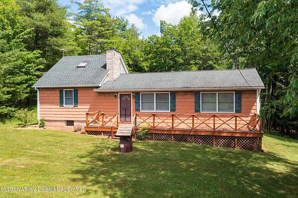 This well-loved and well-maintained mountain getaway has been lightly used in recent years and is ready for new owners to keep the good vibes going. Set in a truly charming and bucolic location-where dramatic skies give way to firefly-lit evenings-this is a place where relaxation comes naturally. Enjoy year-round mountain views and brilliant sunsets from the large west-facing windows, or while relaxing on the welcoming front porch. Out back, the covered barbecue deck overlooks a peaceful forest and a generous expanse of lush green lawn-perfect for a game of frisbee, practicing your golf swing, or simply unwinding. Venture deeper into the woods of this 3-acre parcel and discover a seasonal stream that meanders through the heart of the property. In the colder months, two wood stoves provide cozy warmth-one in the inviting, light-filled living room with windows on all sides, glowing with Scandinavian pine paneling and opening directly to the back deck. The bright, functional cook's kitchen with an adjacent dining area enjoys its own wood stove and flows easily into the living room, creating a warm and social open layout. One of the three bedrooms is tucked away upstairs, offering added privacy and ample storage. Meanwhile, a full bathroom within one of the downstairs bedrooms makes for a convenient and comfortable primary suite. The large basement is divided into three spacious sections, each with its own potential-whether you envision additional finished living space, game or media rooms, a studio, or more. One section is a fully outfitted workshop with direct walk-out access via two doors to grade. With frontage on two quiet country roads-one in front and one in back-this property offers privacy, charm, and seamless access to four-season recreation. Enjoy skiing at Hunter, Windham, Belleayre, and Plattekill, trout fishing in the Schoharie Creek, and endless hiking through the majestic Catskill High Peaks. Whether you call it home or your happy place, this Catskills retreat is ready for its next chapter.