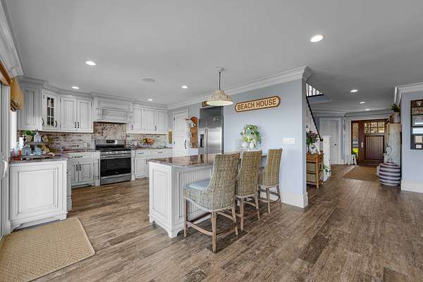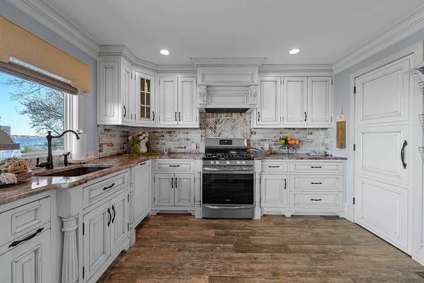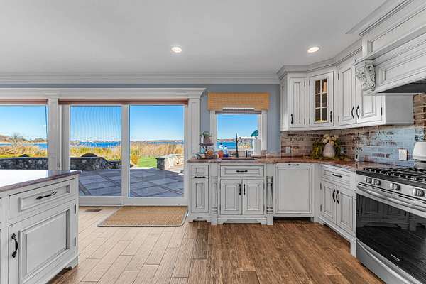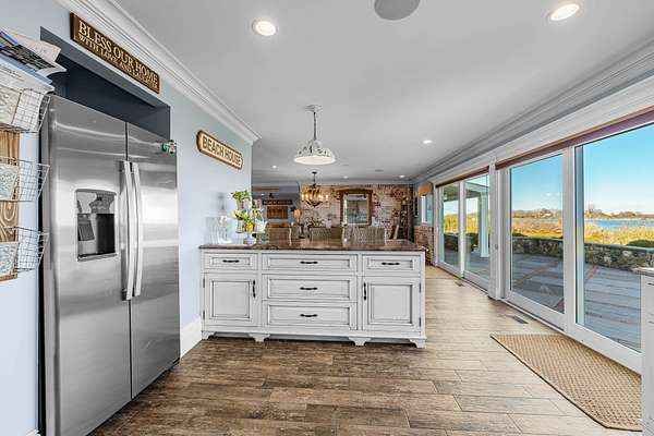 Discover the beauty of Lake Montauk from this impressive lakefront estate, offering sweeping water views and generous living spaces throughout. With 4 bedrooms, 4 full bathrooms, and multiple bonus rooms, this home provides exceptional flexibility for luxurious coastal living. The main level features a large open kitchen, living, and dining area, each room showcasing stunning views of the lake. Two versatile bonus rooms-ideal for a den and home office-add convenience and functionality. A full bathroom and a laundry room complete the first floor. This level also includes a spacious attached garage, offering ease and practicality for year-round living. Below, a full basement provides substantial storage space and presents an excellent opportunity to be finished in the future for additional living area if desired. The upper level is anchored by a serene primary suite overlooking the water, offering breathtaking vistas. Three additional guest bedrooms and two guest bathrooms provide ample space for visitors. Three extra rooms on this level offer endless possibilities-use them as a media room, gym, or studio. Step outside to an expansive patio, featuring a covered section with an outdoor fireplace, perfect for year-round entertaining. An outdoor shower adds a classic coastal touch. A private, easy path leads directly to the beach, making it effortless to launch kayaks, paddle boards, and more. A private mooring completes this exceptional waterfront offering, providing convenient access for boating enthusiasts.