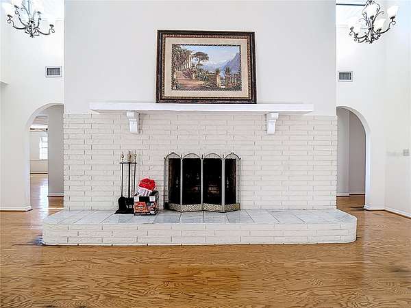 The residence features four spacious bedrooms and two and a half baths across 3,336 square feet. It includes a cozy fireplace and a fully enclosed, gated yard with lush landscaping and St. Augustine grass. The property also boasts a detached carport, a single-car garage with an adjacent workshop, and a stunning pool area with a paved deck.