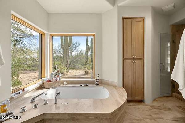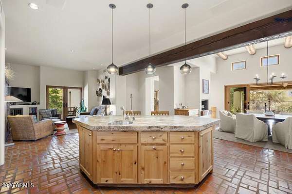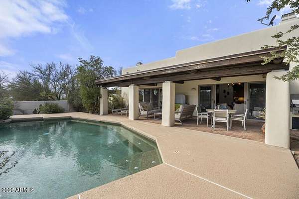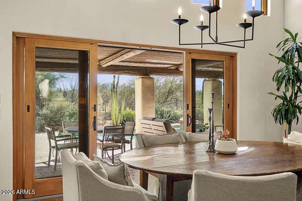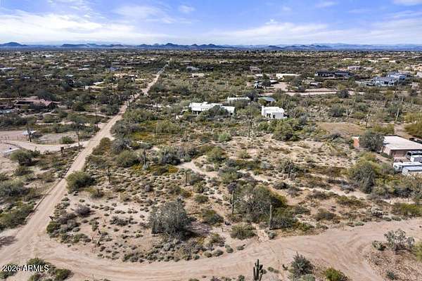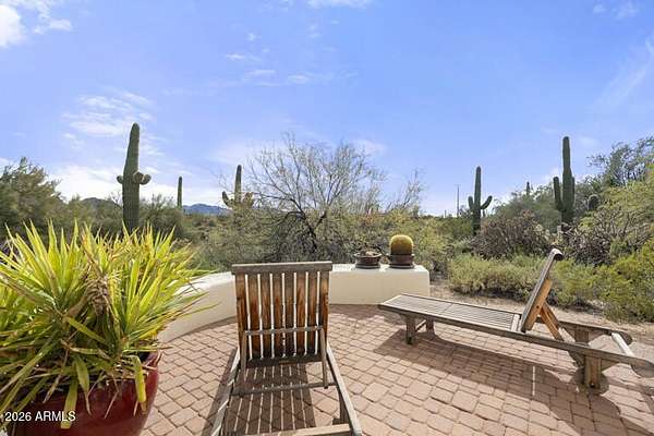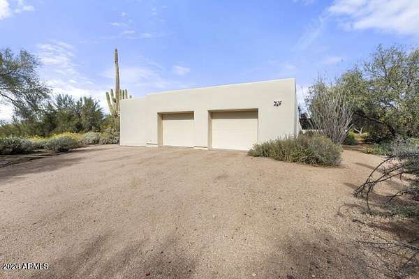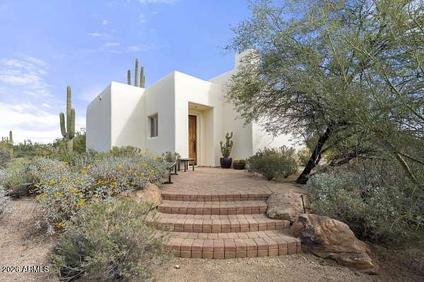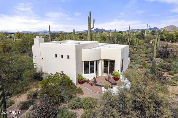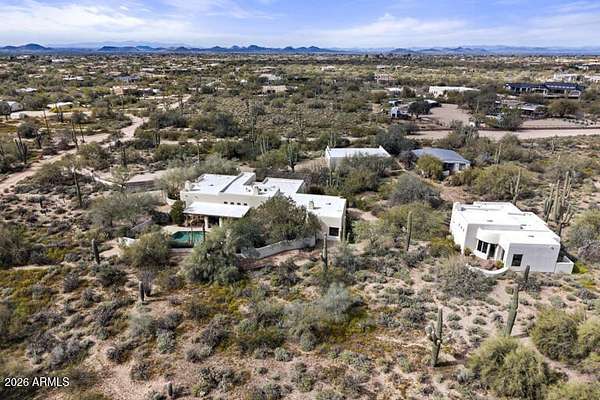 Nestled in the serene desert of North Scottsdale on 4.6 private acres this exceptional property offers privacy, space, and breathtaking views. The single-level main residence (2868 sqft) and a separate guest house (1200 sqft) were designed for effortless living and entertaining. The main home features 2 spacious bedrooms and 2 beautifully appointed baths, designed with an open-concept great room layout ideal for effortless living and entertaining. A large gourmet kitchen anchors the home with , premium appliances, and seamless flow into the dining and living areas. Sliding glass doors frame stunning Pinnacle Peak views and great indoor outdoor living. Step outside to a beautiful pool with built in BBQ. The guest house offers privacy and comfort for visitors. A separate 2 car garage with spacious work shop has a gun safe and a half bath. Free standing storage building to convey as is. Additional contiguous acreage is available for purchase upon request.