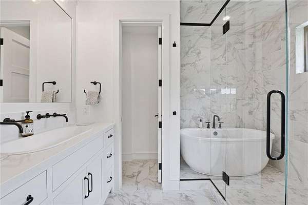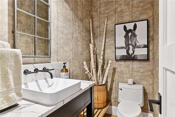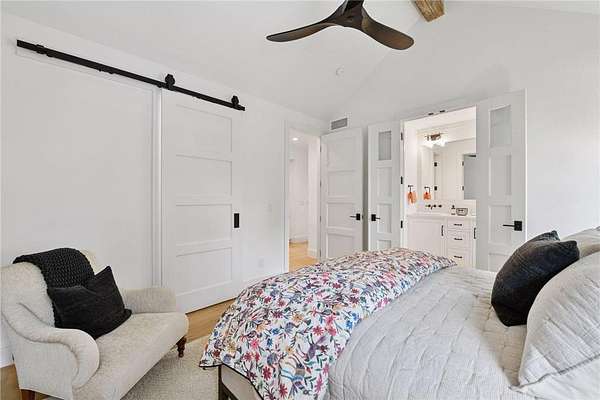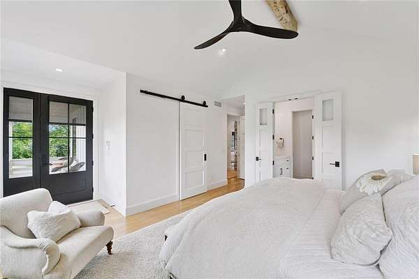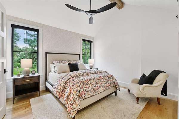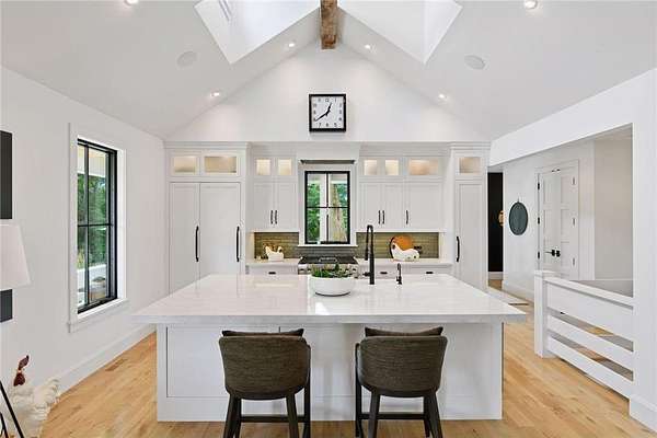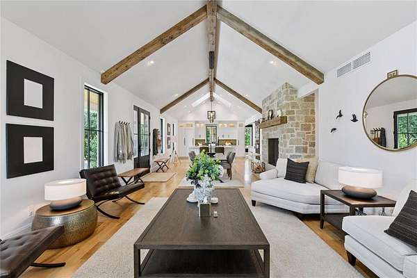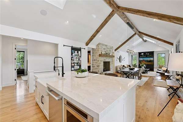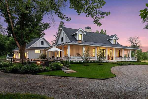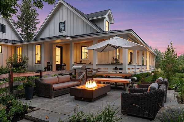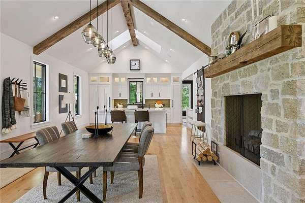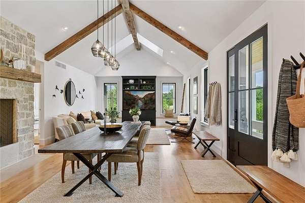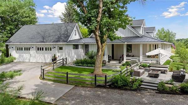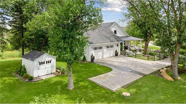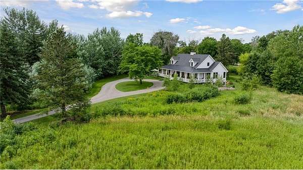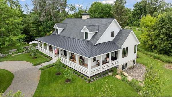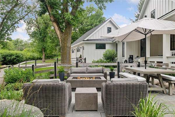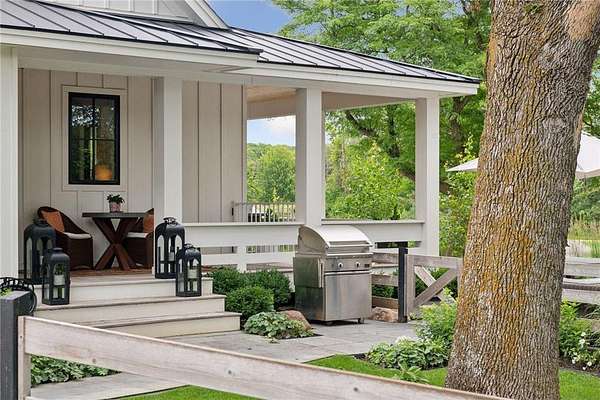 Realize this distinctive modern farmhouse, gracefully situated on 4 private acres of trees, wildflowers and peaceful moments of nature. This home is created with sophisticated simplicity. This 3-bedroom, 3.5-bath retreat opens up to a calming view from every window, it is the ideal "country condo," offering main level living, located just 12 minutes from downtown Wayzata. The home features vintage beams and full window skylights that enhance the vaulted ceilings, complemented by a stunning floor-to-ceiling Indiana limestone fireplace and 5' wide plank white oak floors. The main level presents a primary bedroom and a guest bedroom, both featuring en-suite baths. Additionally, there is a main floor laundry room, 1/2 bath and a dedicated office space with access to a 18x12 deck. The magic happens on the "love this" wrap around front porch, designed with deep rails for built-in leaning and 6' cedar tongue and groove ceiling -- the most perfect spot to end your day. The Friesen stone patio with built-in gas fireplace and outdoor natural gas grill will complete your outdoor living experience.