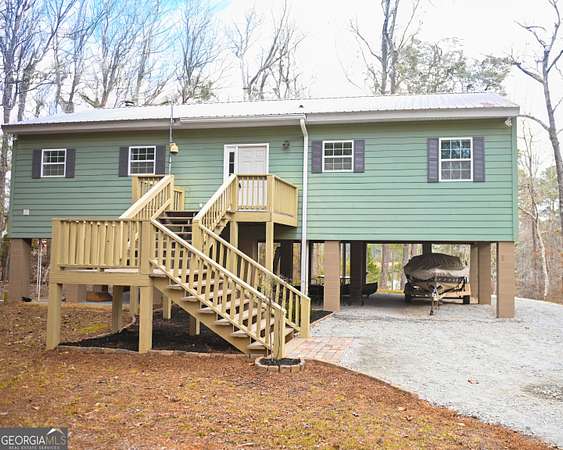 Private lakefront retreat on J. Strom Thurmond Lake, also known as Clarks Hill Lake. This 3 bedroom home is tucked away on two wooded lots at the end of a long private driveway, offering exceptional privacy and versatility. With approximately 1,250 square feet of well designed living space, the property is ideal as a full time residence, weekend escape, or vacation rental. The fully renovated interior features a bright, open concept floor plan with soaring 10 foot ceilings and an easy flow for everyday living and entertaining. Modern updates include porcelain tile and hardwood flooring, energy efficient windows, and a tankless water heater for comfort and efficiency. Step outside to the beautiful back deck overlooking serene lake views, the perfect place to relax, sip your morning coffee, or unwind at the end of the day while taking in the peaceful surroundings. A private driveway extends to the U.S. Army Corps of Engineers line, crossing a new heavy duty golf cart bridge and providing direct access to a private dock area ideal for boating, fishing, kayaking, and enjoying the lake lifestyle. Located near wildlife management areas, the property offers outstanding recreational access and a peaceful natural setting. Below the home, an additional approximately 1,250 square feet is stubbed for plumbing, offering excellent potential for future expansion, guest accommodations, or storage. Don't miss this rare opportunity to own a private lakefront home on one of the Southeast's most sought after lakes. Note: All improvements and dock options are subject to Corps approval; however, a slip dock with a longer gangway may be possible provided the required 50-foot setback is maintained.