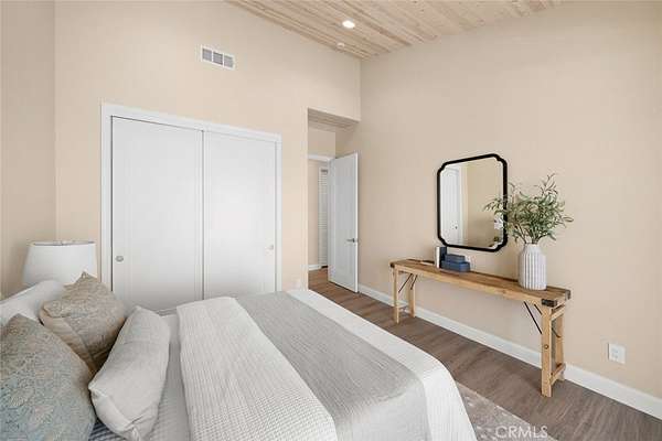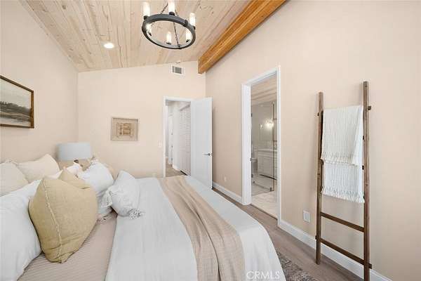 The split-wing layout provides privacy and flexibility. The primary suite is a serene space with private deck access, a spa-inspired ensuite bath with soaking tub, walk-in shower, dual-sink vanity with seating area, and a generous walk-in closet. On the opposite wing, two additional bedrooms, each with deck access, are complemented by two full bathrooms, offering comfortable accommodations for family or guests.