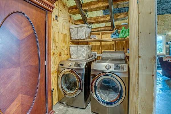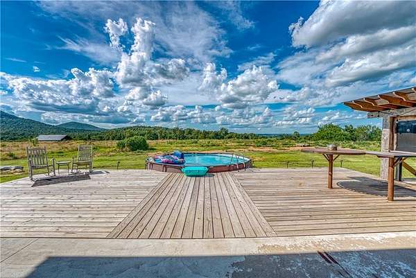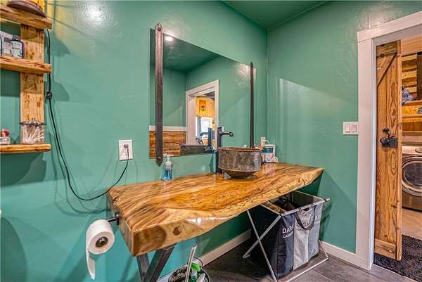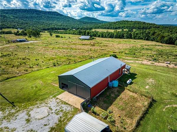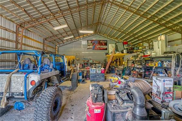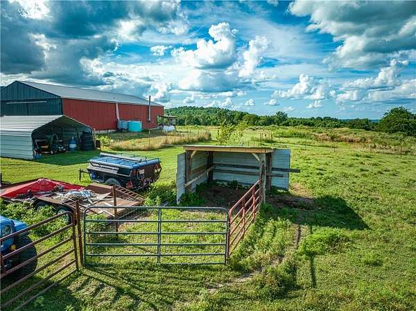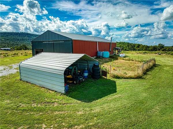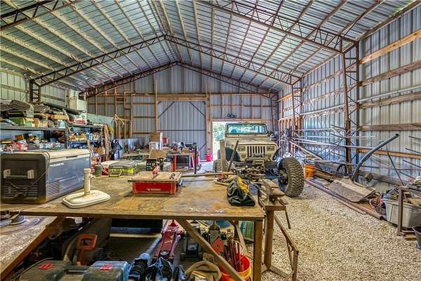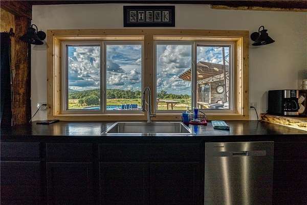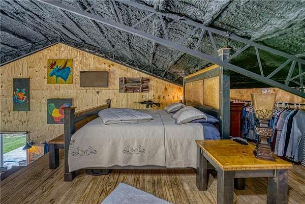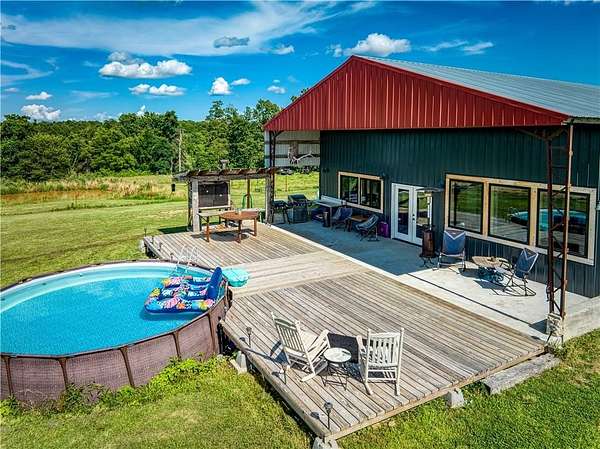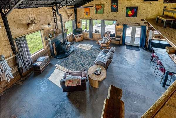 Hay Barn HALLELUJAH! Step into barndominium living at its finest! Situated on 13.76 acres, this 1 BR 2 BA converted hay barn is so unique and has so much to offer. There is a good mix of woods and pasture with 2 ponds, and workshop space to boot. There are established garden beds, an amazing outdoor kitchen and the sunsets from the deck are GORGEOUS! All the logs, doors and stairs in the home are recycled from a 100+ year old cabin. There is barnwood that was recycled from an old barn. The tub in the downstairs bath is a customized stock tank. The gorgeous tile 6 x 6 shower upstairs is complete with a large rain head shower. Behind the wood stove is a custom steel heat plate with a gorgeous custom mantel from the same cabin as the other amenities. The custom island is steel and concrete and includes the gas cook top. There is a built-in electric oven. Walk out onto the deck that leads to your new pool and open your mind to all the meals you can enjoy from the custom smoker that you prep on the unique island.