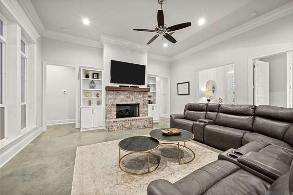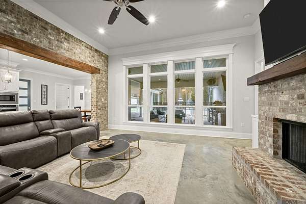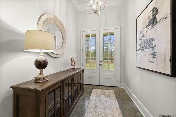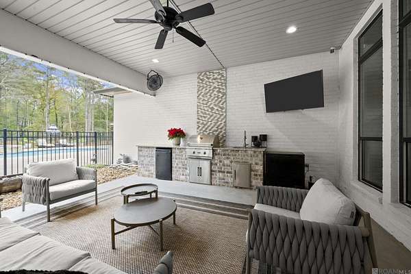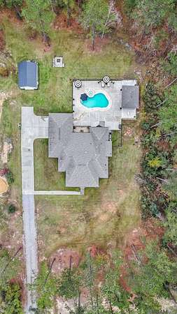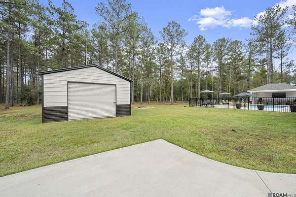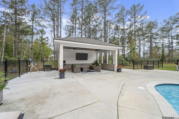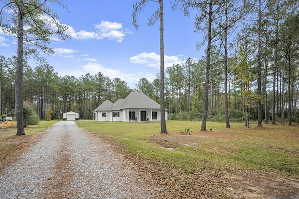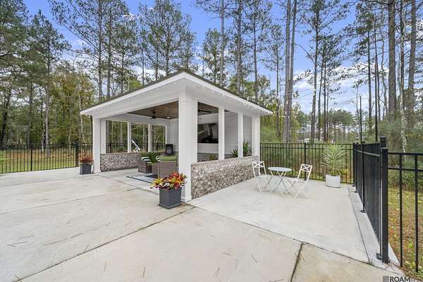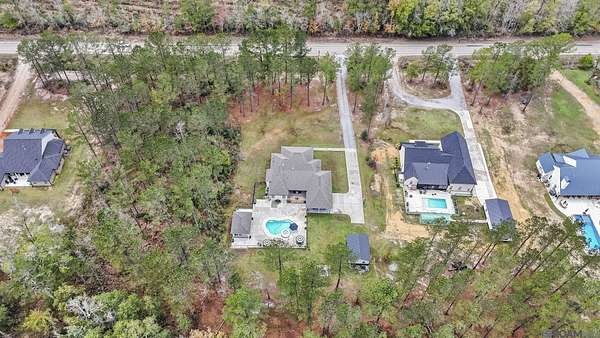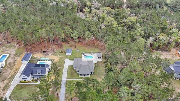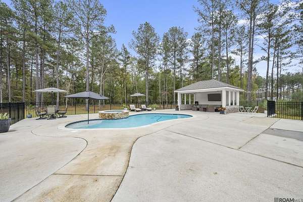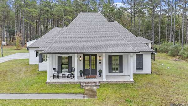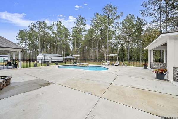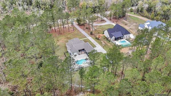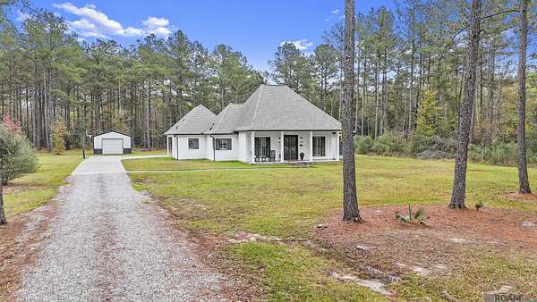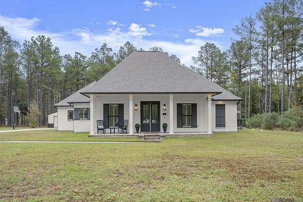 Welcome home to this beautiful 4 bedroom, 2.5 bath custom Acadian-style home situated on 2 acres in desirable Livingston Farms. Only 5 years old, this home offers a functional triple-split floor plan with high-end finishes throughout. The open living area features a gas fireplace, polished concrete floors, and a wall of windows overlooking the backyard oasis. A brick arch with a cypress beam leads into the kitchen, which includes leathered granite countertops throughout the home, stainless steel appliances, a gas cooktop, a large walk-in pantry with a window, and an office nook conveniently located in the laundry room. Custom trim work above the windows and plantation shutters throughout add to the home's detailed craftsmanship. The private primary suite includes a stand-alone soaking tub, custom tile shower with a bench, and a large walk-in closet with built-ins. The additional bedrooms are well-sized and thoughtfully positioned for privacy. Outdoor living is exceptional with a saltwater gunite pool featuring a tanning ledge and hot tub, extended concrete decking, and an iron fence. The new cabana offers stained wood ceilings, recessed lighting, dual fans, a brick accent wall, mounted outdoor TV, and a spacious open-air seating area overlooking the wooded acreage and pool. The rear covered patio also includes a full outdoor kitchen ideal for entertaining. An 18x24 shop off of the driveway provides added storage or workspace. As an added bonus, this home is located in flood zone X so no flood insurance is required. This property blends peaceful acreage living with modern amenities and timeless custom details throughout. Schedule your showing today to see all this beautiful home has to offer!