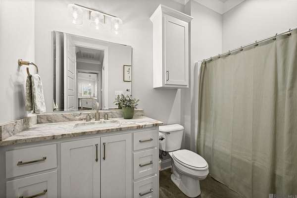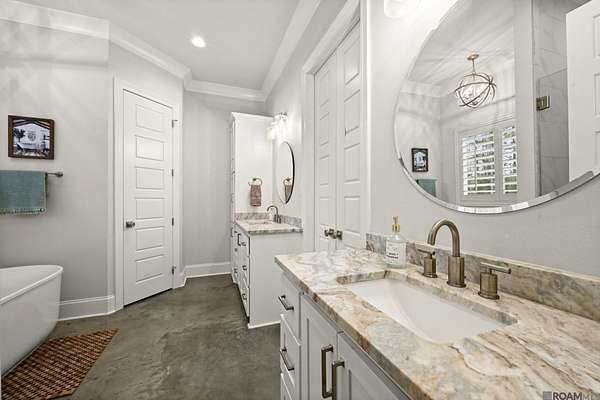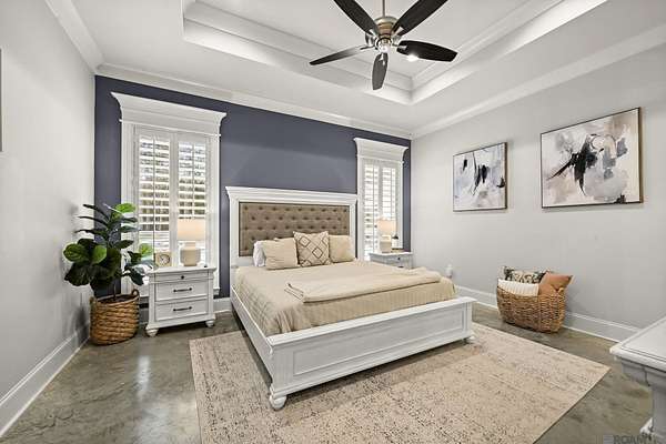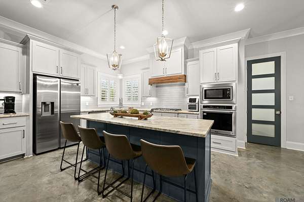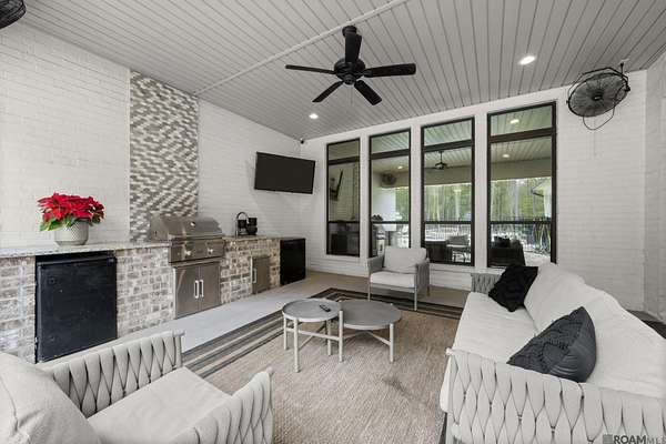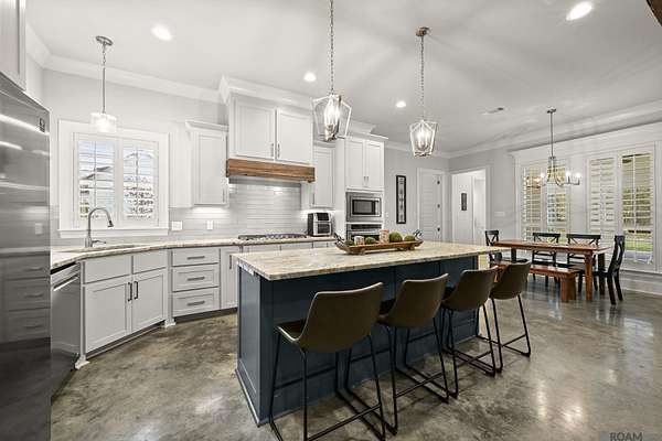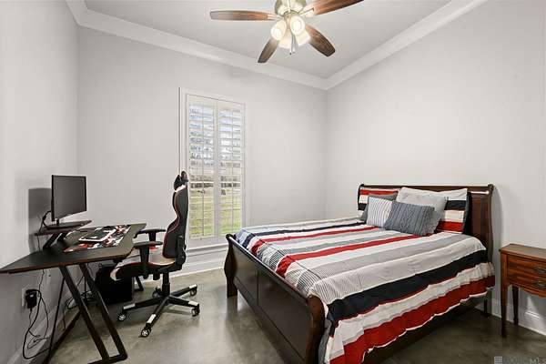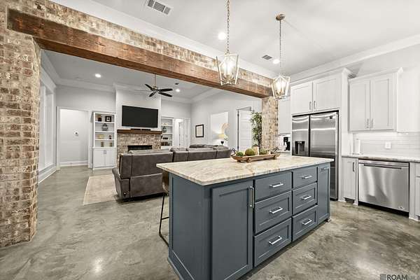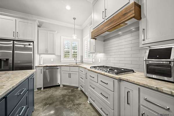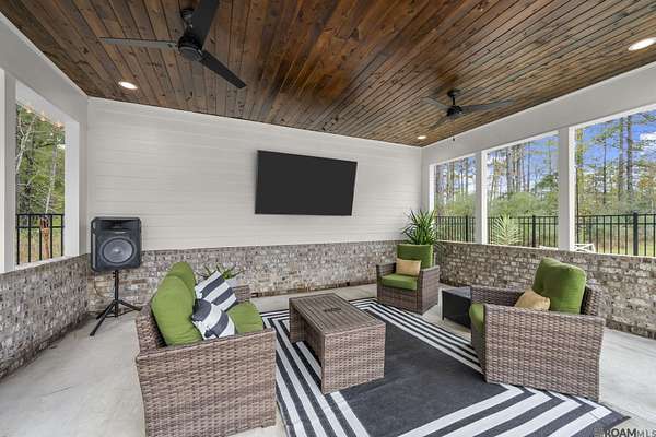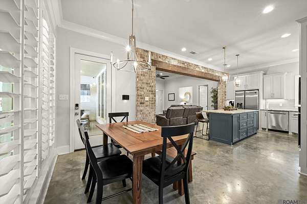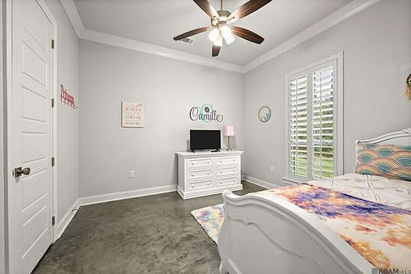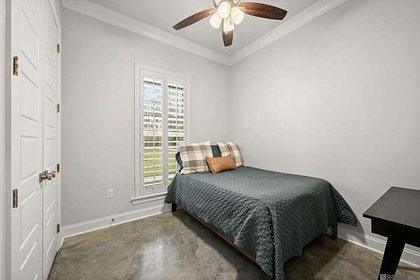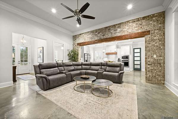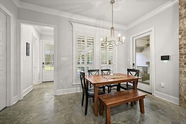 Welcome home to this beautiful 4 bedroom, 2.5 bath custom Acadian-style home situated on 2 acres in desirable Livingston Farms. Only 5 years old, this home offers a functional triple-split floor plan with high-end finishes throughout. The open living area features a gas fireplace, polished concrete floors, and a wall of windows overlooking the backyard oasis. A brick arch with a cypress beam leads into the kitchen, which includes leathered granite countertops throughout the home, stainless steel appliances, a gas cooktop, a large walk-in pantry with a window, and an office nook conveniently located in the laundry room. Custom trim work above the windows and plantation shutters throughout add to the home's detailed craftsmanship. The private primary suite includes a stand-alone soaking tub, custom tile shower with a bench, and a large walk-in closet with built-ins. The additional bedrooms are well-sized and thoughtfully positioned for privacy. Outdoor living is exceptional with a saltwater gunite pool featuring a tanning ledge and hot tub, extended concrete decking, and an iron fence. The new cabana offers stained wood ceilings, recessed lighting, dual fans, a brick accent wall, mounted outdoor TV, and a spacious open-air seating area overlooking the wooded acreage and pool. The rear covered patio also includes a full outdoor kitchen ideal for entertaining. An 18x24 shop off of the driveway provides added storage or workspace. As an added bonus, this home is located in flood zone X so no flood insurance is required. This property blends peaceful acreage living with modern amenities and timeless custom details throughout. Schedule your showing today to see all this beautiful home has to offer!