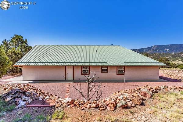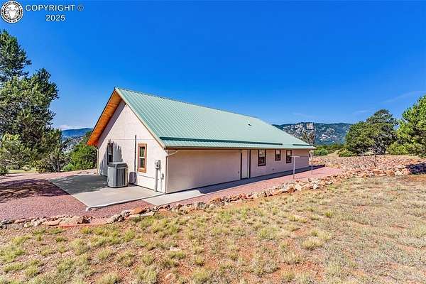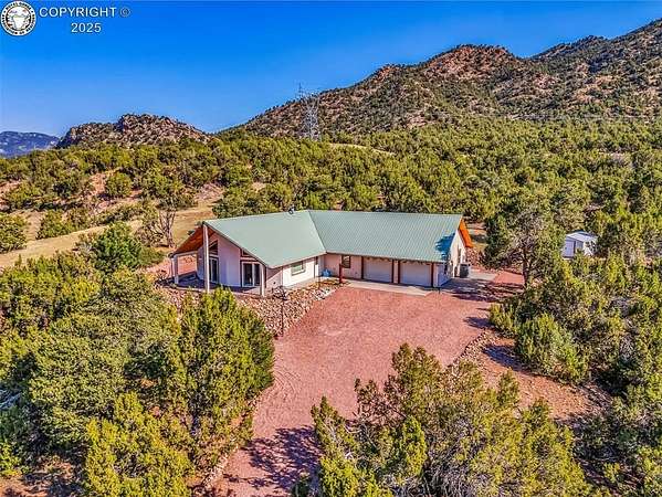 Mountain Views, Total Privacy, and Prime Location-This One Has It All! This beautifully maintained, single-level 3-bedroom, 2-bath property is set on 36 private acres just off Highway 9-only 11 miles from town, yet worlds away from the hustle and bustle. Backing up to over 13,000 acres of BLM land in GMU 581, it's a rare combination of peace, privacy, and outdoor adventure. Inside, you'll find an open-concept layout with a spacious kitchen featuring ample storage, a large breakfast bar that seats six, and a bright, airy dining/living area. Two sets of heavy-duty French doors lead to a private covered patio-perfect for soaking in the incredible mountain views and star-filled skies. A bonus flex space off the living area includes a beautiful soapstone wood stove and can be used as a formal dining room, office, or cozy sitting area. The primary suite is a true retreat with large windows, an 8-foot walk-in closet, and a five-piece bath complete with soaking tub & walk-in shower. Two additional bedrooms offer large closets and great natural light. The laundry room is located just off the attached two-car garage and includes built-in cabinetry and a linen closet for added storage. This home was built for mountain living with hardy features, including a durable metal roof, stucco exterior, tall pine ceilings, newer double-pane windows, and a strong domestic well producing over 15 GPM. A 1,200-gallon cistern provides extra water storage, and the iron filter and water softener ensure excellent water quality. You'll stay comfortable year-round with electric baseboard heaters, an electric furnace, a soapstone stove, and A/C for those warmer summer months. Outside, the property is clean and well cared for with rock-lined driveways, two sheds including a large Morton shed, and a powered RV-ready carport. Whether you're looking for a forever home, a getaway, or a base for outdoor adventures, this property offers the perfect mix of comfort, freedom, and natural beauty.