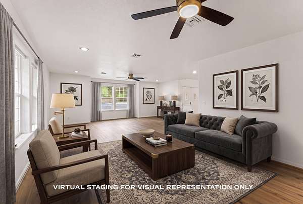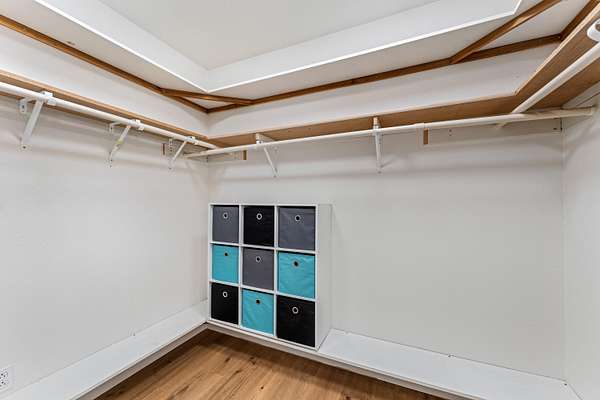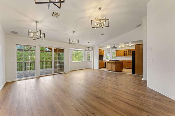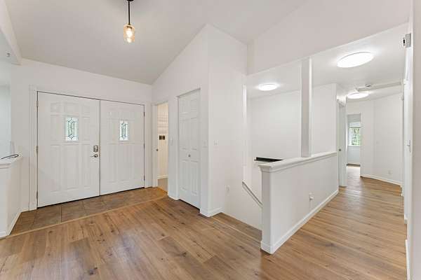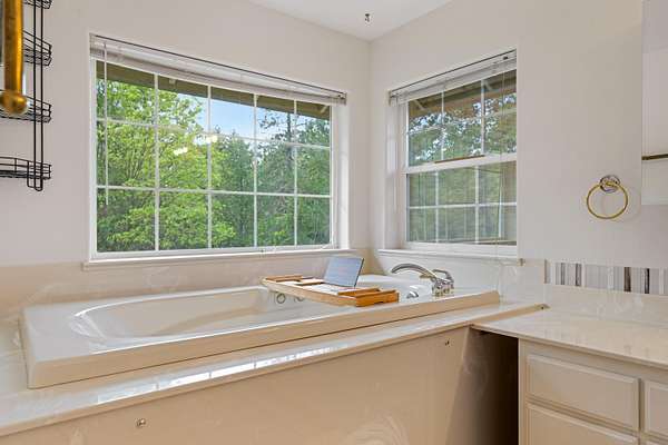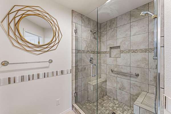 - Breakfast Bar, Ceiling Fan(s), Double Vanity, Enclosed Toilet(s), Kitchen Island, Linen Closet, Open Floorplan, Pantry, Primary Downstairs, Shower/Tub Combo, Solid Surface Counters, Tile Counters, Tile Shower, Vaulted Ceiling(s), Walk-In Closet(s)