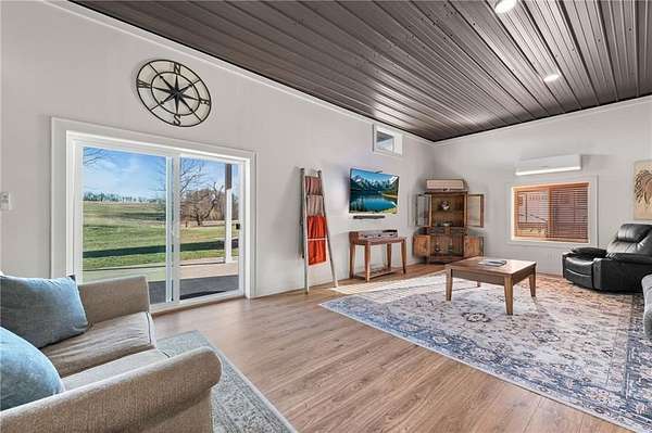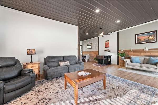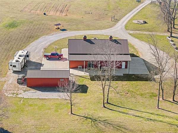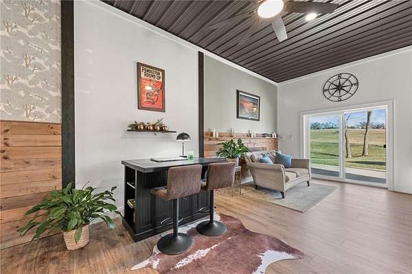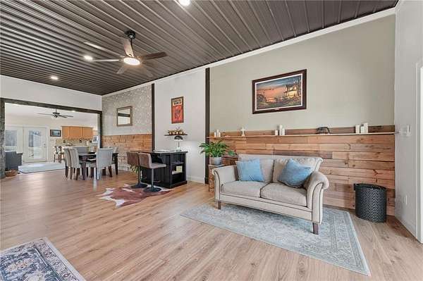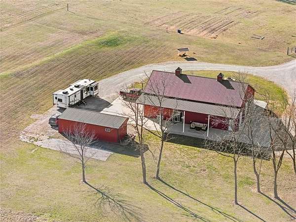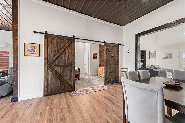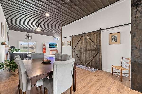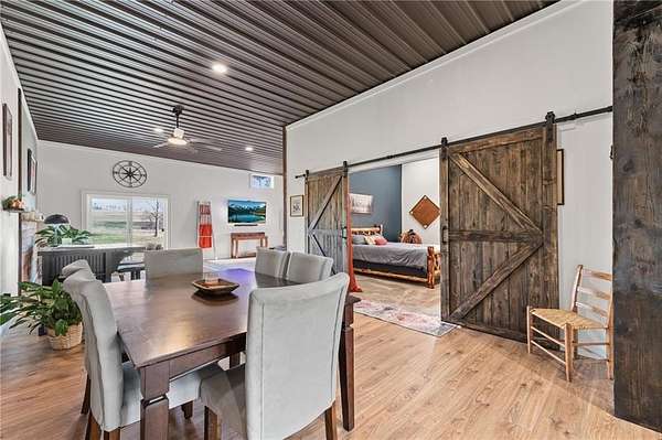 Welcome to your private slice of country paradise! Nestled on over 7.5 acres, this stunning barndominium has been thoughtfully expanded and upgraded to offer the perfect blend of charm, functionality, and wide-open space. Now featuring over 2,100 square feet, the home includes an additional bedroom, living area, and dining space-giving you room to spread out while maintaining that cozy, inviting feel. The newly added space is truly stunning, showcasing rustic lap siding accents, sliding barn doors, and an abundance of natural light pouring in through sliding glass doors that open to peaceful views of the pond. Whether you're sipping coffee at sunrise or unwinding at sunset, this space delivers. Fresh interior paint, brand-new carpet and LVP flooring make the home feel crisp and move-in ready, while the open-concept layout keeps everyday living easy and connected. Outside, the property is ready for your hobby farm dreams with newly added fencing for horses and a charming outbuilding featuring two stalls. With plenty of room to roam, garden, or simply enjoy the quiet countryside, this property offers a lifestyle that's hard to find. With these thoughtful additions and updates, it truly delivers the best of both worlds: modern comfort paired with peaceful country living. This is more than just a home-it's a lifestyle.