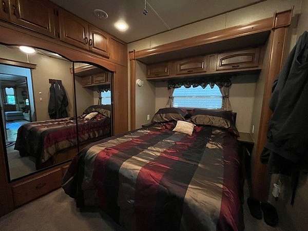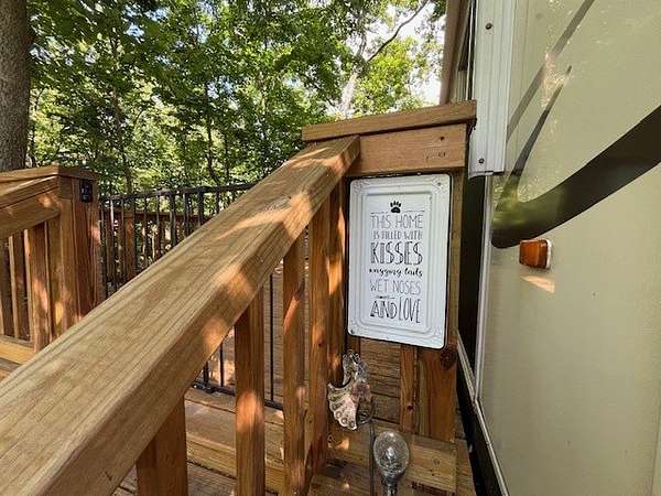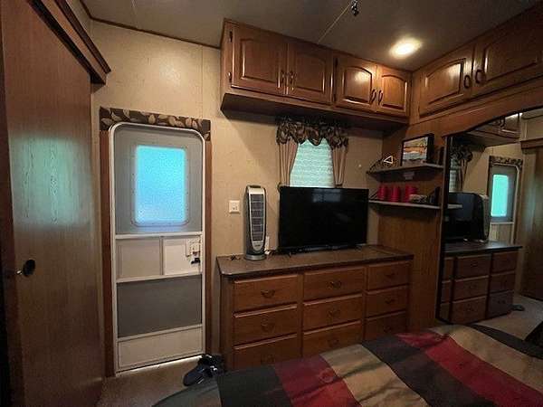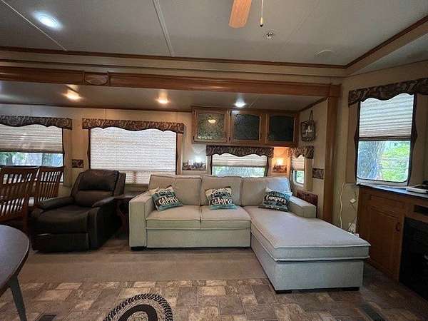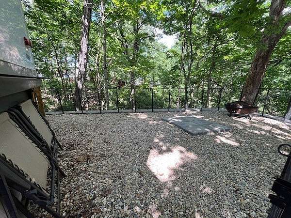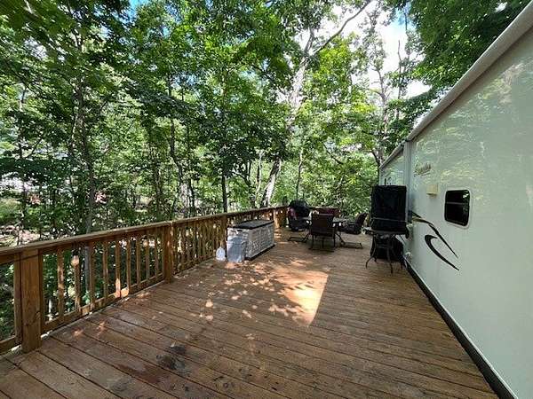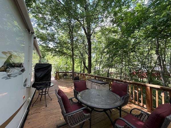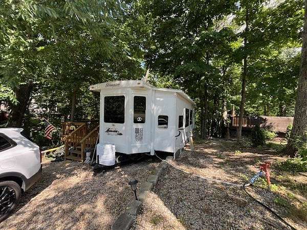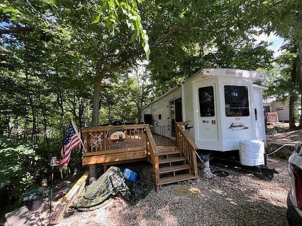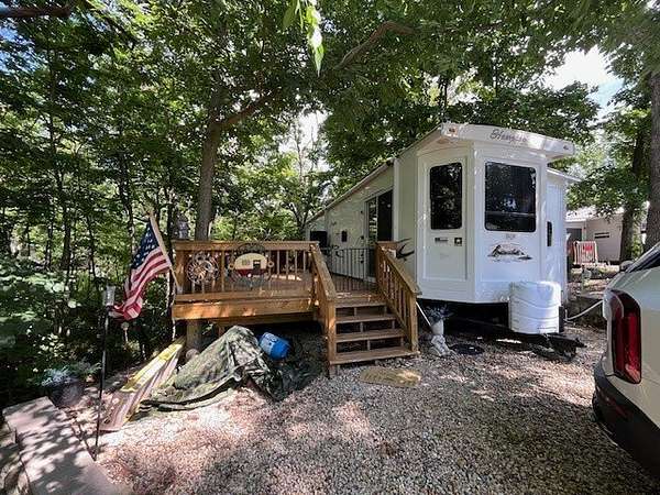 Welcome to Lot 852 in Woodsmoke Ranch! Situated on a secluded and shaded lot overlooking the ravine, this property features a beautiful 2010 Hampton Crossroads destination trailer designed for extended stays. With two stationary roofed slide-outs and new flooring in those areas, this spacious unit offers a bright and inviting living room with an electric fireplace, a fully equipped kitchen (all appliances, pots & pans, silverware, dishes etc all stay), and a large bathroom with a shower. The roof was sealed in 2024. The primary bedroom includes ample built-in cabinetry and a closet for plenty of storage. Additional sleeping sections throughout the trailer including a pullout couch. Fully furnished and move-in ready, it's perfect for your next camping adventure. Enjoy outdoor living on the large (2 year new) lighted deck, ideal for relaxing or entertaining. The trailer is meant to stay in place and has added awnings over the slideouts for extra protection. A gravel driveway adds convenience. This is a Category 6 lot with yearly dues of $3,115.77, which includes water, electric, garbage, and access to all of Woodsmoke Ranch's incredible amenities. Woodsmoke Ranch amenities: 2 pools, 2 stocked fishing ponds, 3 pavilions, basketball courts, sand volleyball, gaga ball, bags, 2 playgrounds, RC car racetrack, baseball field, laundromat, convenience store, cafe, horse stables (for rent), adult lounge, Mygrain Saloon, events planned year long and so much more. RV campground community, cannot be a primary residence. Gated community; showings by appointment only. No access without an appointment.