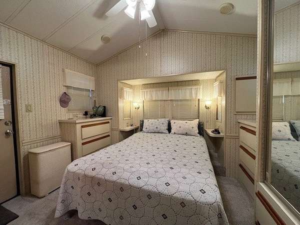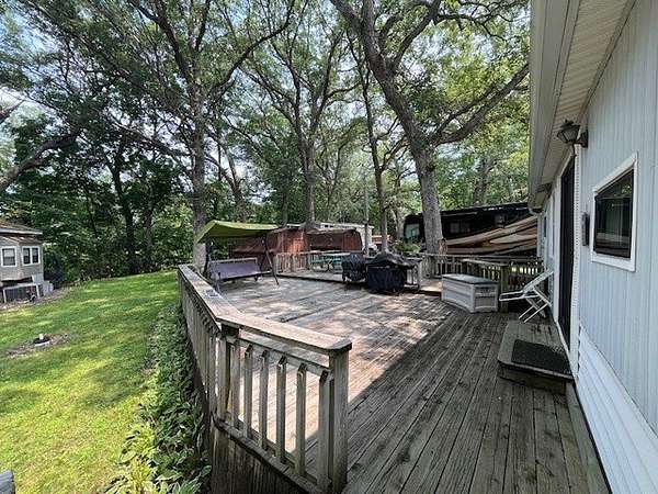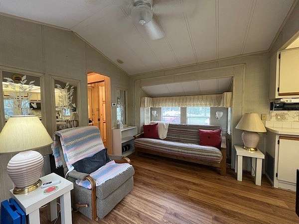 Located within the gated community of Woodsmoke Ranch, Lot 232 offers a well-maintained and thoughtfully upgraded 1988 Chariot Eagle Park Model. This one-bedroom unit features a large front-end kitchen with an impressive 21 cabinets, 4 drawers, and a center island with a pull-out table extension and four chairs-perfect for hosting and everyday functionality. All appliances stay, and every window and the patio door is fitted with blinds. The spacious living room offers plenty of natural light and room to relax. The bedroom includes a queen-size bed, two four-drawer dressers, two permanent wall-mounted lights, a ceiling fan/light combo, built-in closet, and additional storage. The bathroom features a tub/shower combo. Updated carpet and laminate flooring were installed approximately three years ago. Other upgrades include a roof (2008), water heater (2017), custom shutters (2017), and seamless gutters on the back (installed around 2021). The property also includes central air, a shed for storage, a front deck (redone in 2021), and a back deck, along with a swing, picnic table, grill, and lawnmower-all included. Propane tank is owned. This turnkey property is being sold fully furnished. Category 5 lot with yearly dues of $2,749.12, which includes water, electric, garbage, and full access to all Woodsmoke Ranch amenities. Woodsmoke Ranch amenities: 2 pools, 2 stocked fishing ponds, 3 pavilions, basketball courts, sand volleyball, gaga ball, bags, 2 playgrounds, RC car racetrack, baseball field, laundromat, convenience store, cafe, horse stables (for rent), adult lounge, Mygrain Saloon, events planned year long and so much more. RV campground community, cannot be a primary residence. Gated community; showings by appointment only. No access without an appointment.
