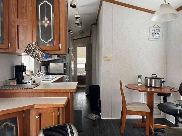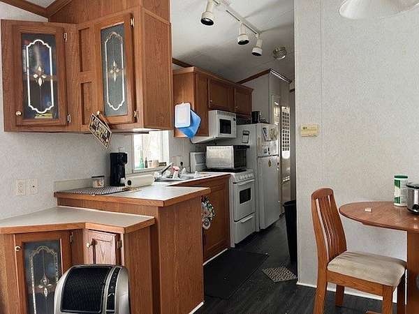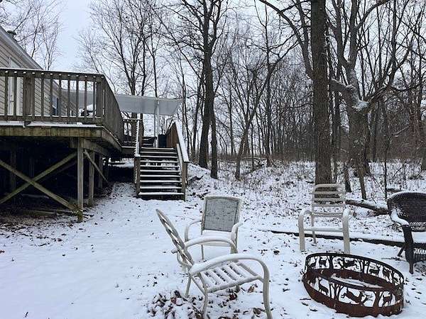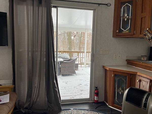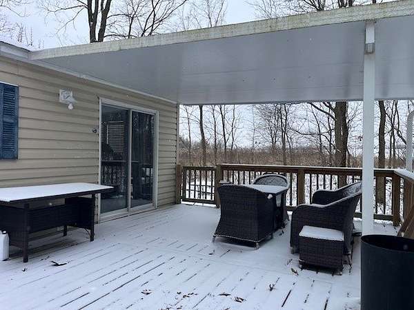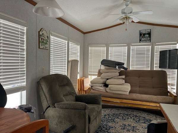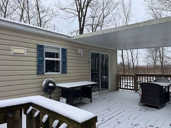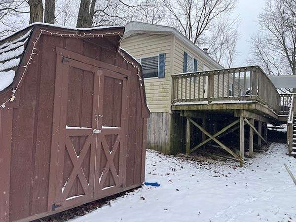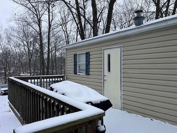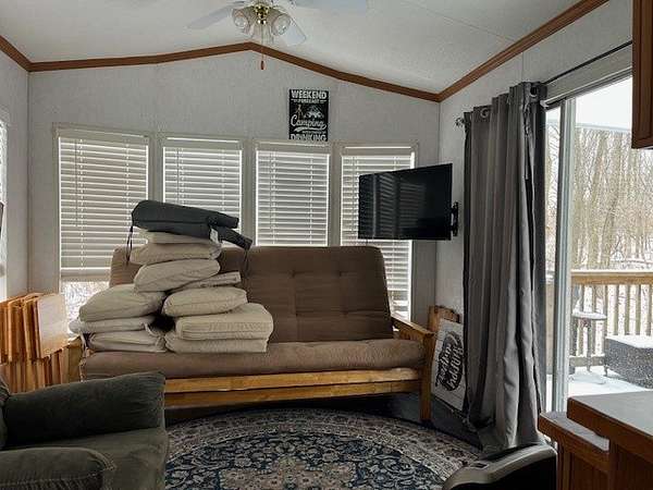 Looking for a home away from home? Need a vacation spot? This lot in the gated campground community of Woodsmoke Ranch is off the beaten path in a secluded setting. No rear neighbors as it backs to a corn field and sits high up on a hill at the back of the park. This 2005 Summit Park Model features a bedroom plus bunk house. The bunk house was turned into a home office but could easily be converted back for additional sleeping quarters. Spacious living rooms with patio doors that lead out to the large covered deck (large portion redone in 2019). The kitchen has plenty of cabinets and table area. With the exception of the bedroom there are wood laminate floors throughout. Lots of entertaining areas outside. Paved driveway. Shed for storage. Fully furnished contact listing agent to confirm what personal items will be removed, if any. Category 5 lot with yearly dues of $2749.12 that includes water, electric and garbage. Woodsmoke Ranch amenities: 2 pools, 2 stocked fishing ponds, 3 pavilions, basketball courts, sand volleyball, gaga ball, bags, 2 playgrounds, RC car racetrack, baseball field, laundromat, convenience store, cafe, horse stables (for rent), adult lounge, Mygrain Saloon, events planned year long and so much more. RV campground community, cannot be a primary residence. Gated community; showings by appointment only. No access without an appointment.