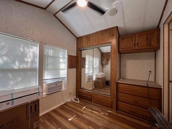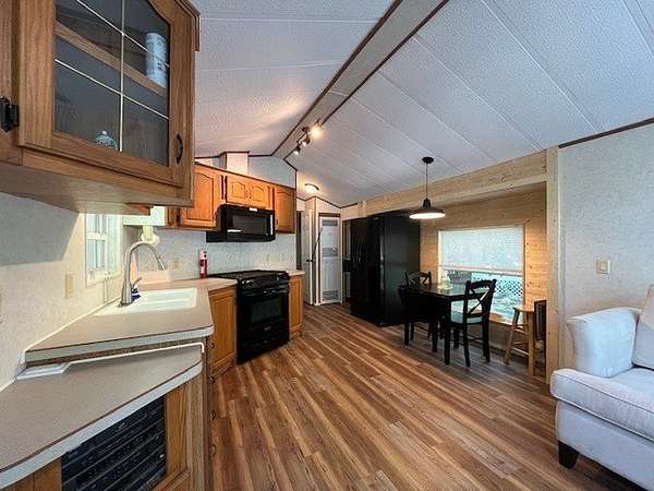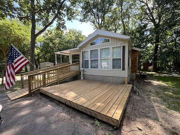 Located near Western Town in Woodsmoke Ranch, Lot 1417 features a beautifully remodeled 1998 Hampton Park Model on a spacious Category 5 lot. This one-bedroom unit offers a bright and open layout with high ceilings throughout, a generous living room, a large kitchen with ample cabinetry, and a full bathroom. Enjoy the outdoors with a brand new ramp in both the front and back, a large front deck, and additional deck space in the rear-perfect for relaxing or entertaining guests. The attached screen room provides extra living space and a comfortable area to enjoy the fresh air without the bugs. Additional highlights include a paved driveway and a storage shed for convenience. Annual dues are 2,749.12 and include water, electric, garbage, and access to all the park's amenities. Woodsmoke Ranch amenities: 2 pools, 2 stocked fishing ponds, 3 pavilions, basketball courts, sand volleyball, gaga ball, bags, 2 playgrounds, RC car racetrack, baseball field, laundromat, convenience store, cafe, horse stables (for rent), adult lounge, Mygrain Saloon, events planned year long and so much more. RV campground community, cannot be a primary residence. Gated community; showings by appointment only. No access without an appointment.