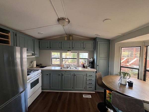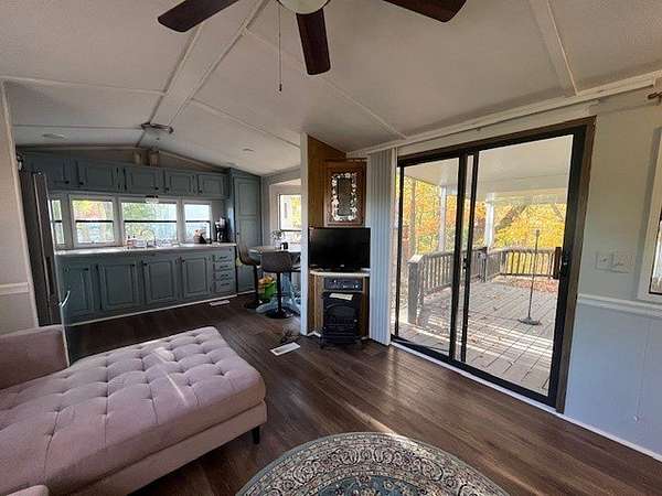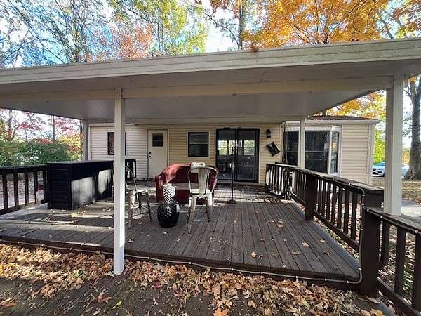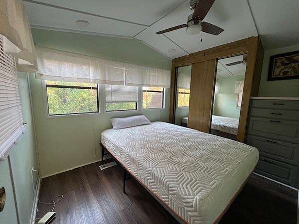 Welcome to Lot 1216 at Woodsmoke Ranch! This 1986 Mallard Park Model offers a comfortable and well-maintained getaway tucked back on a cul-de-sac lot close to Western Town and Pool 1. Inside, you'll find a spacious one-bedroom layout featuring a primary bedroom with a built-in dresser, closet, and full-size mattress. The front-end kitchen provides ample cabinet space and includes appliances, with the refrigerator being approximately two years old. The roomy living area opens through sliding doors to a covered deck that extends to an uncovered deck-perfect for relaxing or entertaining outdoors. The bathroom features a convenient tub/shower combo, and wood laminate flooring runs throughout the home. Fully furnished for your convenience, this property also includes a new patio and a storage shed. Located in a Category 4 section with yearly dues of $2,382.44, which include water, electric, garbage, and access to all park amenities. Woodsmoke Ranch amenities: 2 pools, 2 stocked fishing ponds, 3 pavilions, basketball courts, sand volleyball, gaga ball, bags, 2 playgrounds, RC car racetrack, baseball field, laundromat, convenience store, cafe, horse stables (for rent), adult lounge, Mygrain Saloon, events planned year long and so much more. RV campground community, cannot be a primary residence. Gated community; showings by appointment only. No access without an appointment.