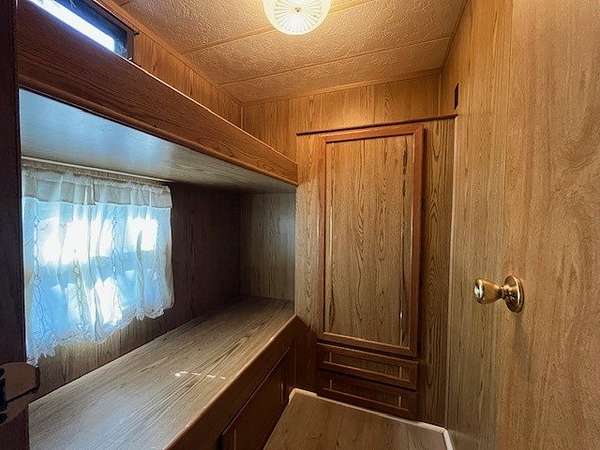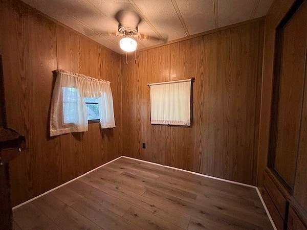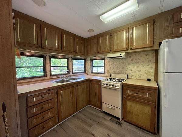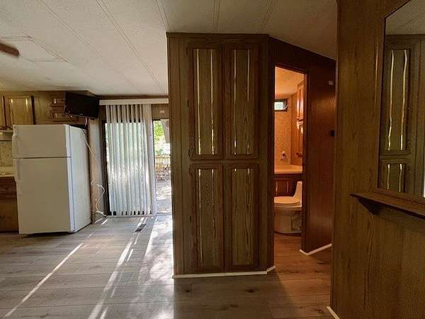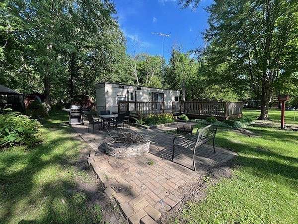 Welcome to Lot 1206 at Woodsmoke Ranch, featuring a 1989 park model with a full bedroom and an additional two-bed bunk room-both equipped with built-in storage for clothing and personal items. The spacious living room offers plenty of room for furniture and flows into a front kitchen with generous counter space and a designated area for a kitchen table. Recent updates include new flooring throughout and a new toilet in the bathroom. Step outside the living room's sliding patio doors to a large front deck, or enjoy the beautiful brick paver patio complete with a built-in fire pit-perfect for gathering and entertaining. The lot also includes a gravel driveway, storage shed, and a private backyard. This is a Category 3 lot with yearly dues of $2015.79, which includes water, electric, garbage, and access to Woodsmoke Ranch's many amenities. Woodsmoke Ranch amenities: 2 pools, 2 stocked fishing ponds, 3 pavilions, basketball courts, sand volleyball, gaga ball, bags, 2 playgrounds, RC car racetrack, baseball field, laundromat, convenience store, cafe, horse stables (for rent), adult lounge, Mygrain Saloon, events planned year long and so much more. RV campground community, cannot be a primary residence. Gated community; showings by appointment only. No access without an appointment.