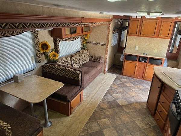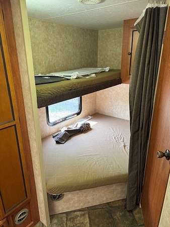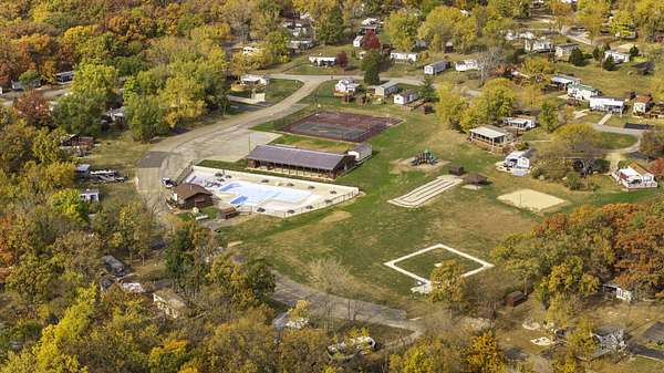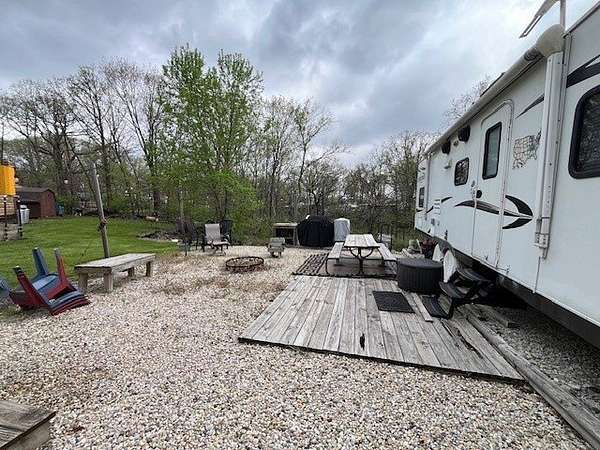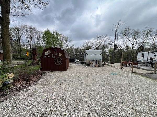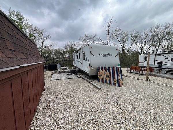 Escape to the tranquility of Woodsmoke Ranch with this well-located lot backing to a peaceful ravine! This lot includes a 2013 KZ Sportsmen Showstopper travel trailer that comfortably sleeps six, featuring a full-size bedroom and a separate bunk room with two beds-perfect for guests or getaways. The trailer has been well maintained with newer tires and a 2-year-old A/C unit. Outside, enjoy a gravel driveway for easy parking, a shed for extra storage, and a fire pit area ideal for relaxing evenings under the stars. Whether you're seeking a weekend retreat or seasonal escape, this turn-key setup offers a great opportunity to enjoy everything Woodsmoke Ranch has to offer. This is a category 5 lot with yearly dues of 2656.15 which includes electric, water, garbage and all the amenities. Woodsmoke Ranch amenities: 2 pools, 2 stocked fishing ponds, 3 pavilions, basketball courts, sand volleyball, gaga ball, bags, 2 playgrounds, RC car racetrack, baseball field, laundromat, convenience store, cafe, horse stables (for rent), adult lounge, Mygrain Saloon, events planned year long and so much more. Gated community; showings by appointment only. RV campground community, cannot be a primary residence.