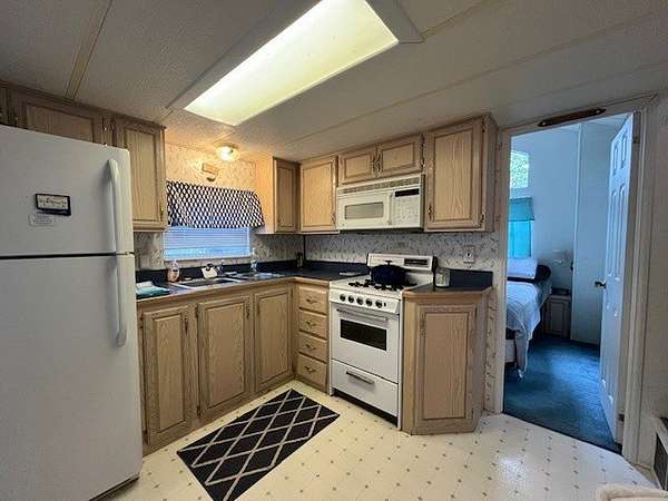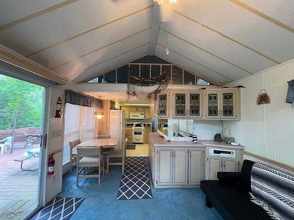 Welcome to Lot 857 within the sought-after Woodsmoke Ranch campground community! This well-maintained property features a 1995 Canterbury Park Model that offers both charm and space. Inside, you'll find a spacious one-bedroom layout along with a huge loft-perfect for additional sleeping accommodations or extra storage. The home boasts high ceilings throughout, enhancing the open and airy atmosphere. The bathroom includes a stand-up shower, and the eat-in kitchen offers ample cabinetry and full-size appliances for easy meal prep. The living room is generously sized, providing a comfortable space to relax or entertain. Step outside to a large deck with a gazebo, ideal for hosting guests or enjoying the peaceful surroundings. A storage shed adds convenience, and the roof is approximately 8 years old. The duct work was redone in 2024, and the unit includes central air conditioning for year-round comfort. Located near Pool 2, this property is situated on a Category 5 lot with yearly dues of 2,656.15, which includes water, electric, garbage, and access to all of Woodsmoke Ranch's fantastic amenities. Woodsmoke Ranch amenities: 2 pools, 2 stocked fishing ponds, 3 pavilions, basketball courts, sand volleyball, gaga ball, bags, 2 playgrounds, RC car racetrack, baseball field, laundromat, convenience store, cafe, horse stables (for rent), adult lounge, Mygrain Saloon, events planned year long and so much more. RV campground community, cannot be a primary residence. Gated community; showings by appointment only. No access without an appointment.