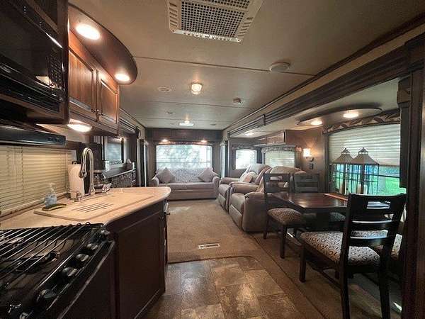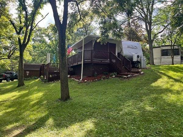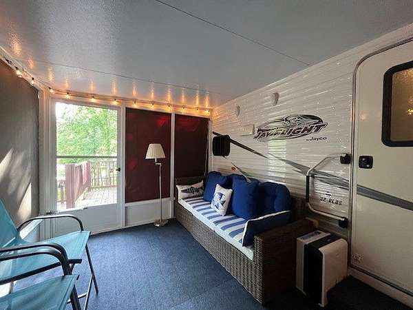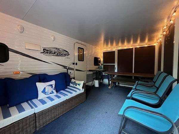 Located on a desirable corner lot within Woodsmoke Ranch, Lot 692 features a well-maintained 2014 Jayco travel trailer (situated up on the hill) offering comfort, functionality, and plenty of entertaining space. Inside, you'll find a cozy bedroom with a full-size bed and ample built-in storage. The bathroom, accessible from both the hallway and bedroom, includes a skylight and a stand-up shower. The kitchen offers a designated dining area, fridge, stove, and abundant cabinetry throughout. The spacious living area includes two recliners, a brand-new couch, and an electric fireplace with a mounted TV above and hidden storage behind. Blinds are installed throughout, and there are two slideouts for added space. Enjoy indoor-outdoor living with direct access to the attached screen room, which is equipped with custom canvas shades for added comfort and privacy. Additional features include rooftop A/C, in-floor heat (electric or propane), a seal-coated roof (2024), and an outdoor kitchen compartment. The multi-level deck is perfect for gatherings and comes with a grill that stays. A fire pit, paved driveway, shed, and included patio furniture complete this fully furnished getaway. Category 3 lot with yearly dues of 1.947.62 which includes water, electric, garbage and park amenities. Woodsmoke Ranch amenities: 2 pools, 2 stocked fishing ponds, 3 pavilions, basketball courts, sand volleyball, gaga ball, bags, 2 playgrounds, RC car racetrack, baseball field, laundromat, convenience store, cafe, horse stables (for rent), adult lounge, Mygrain Saloon, events planned year long and so much more. RV campground community, cannot be a primary residence. Gated community; showings by appointment only. No access without an appointment.