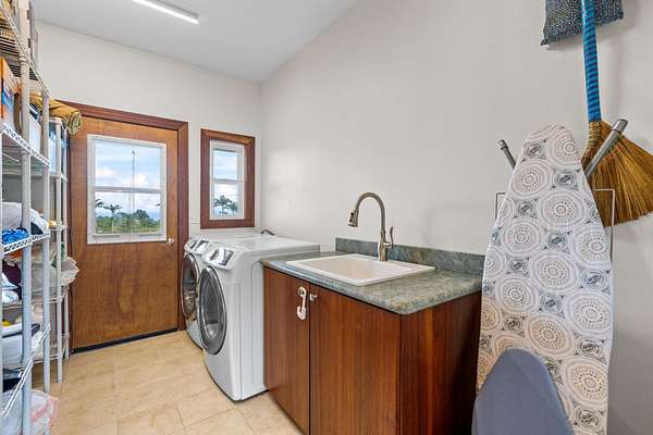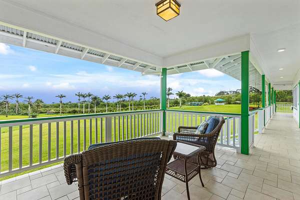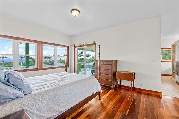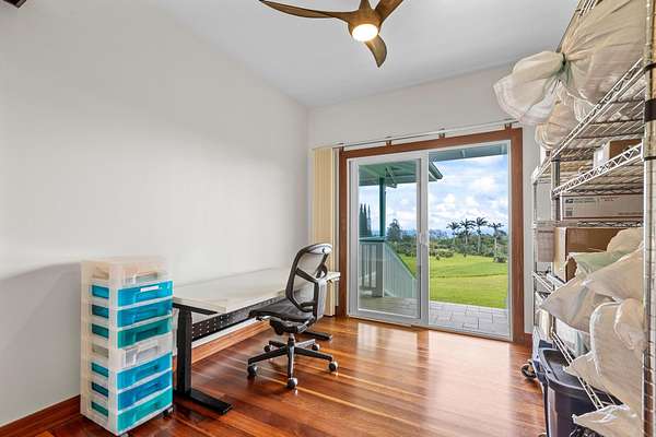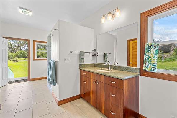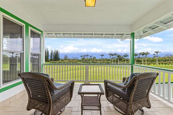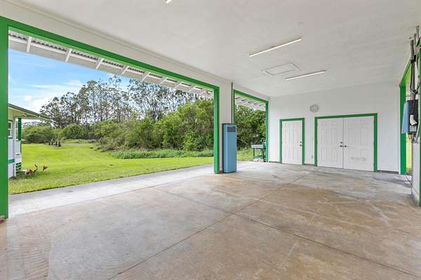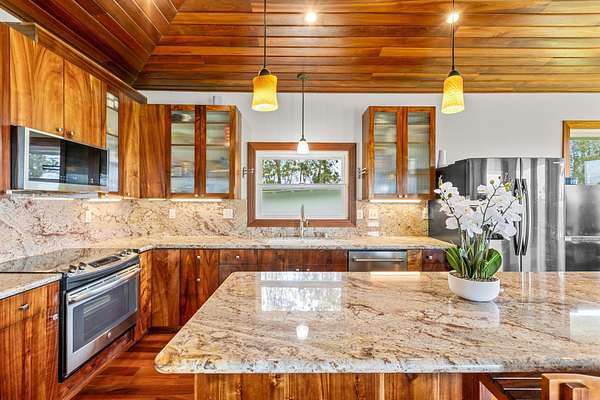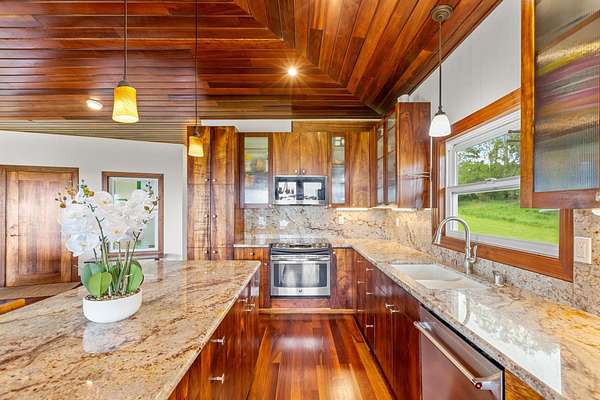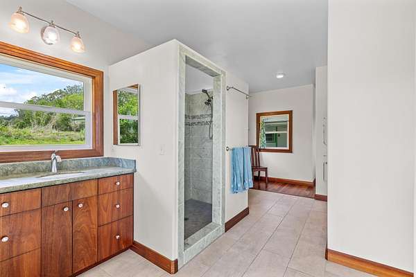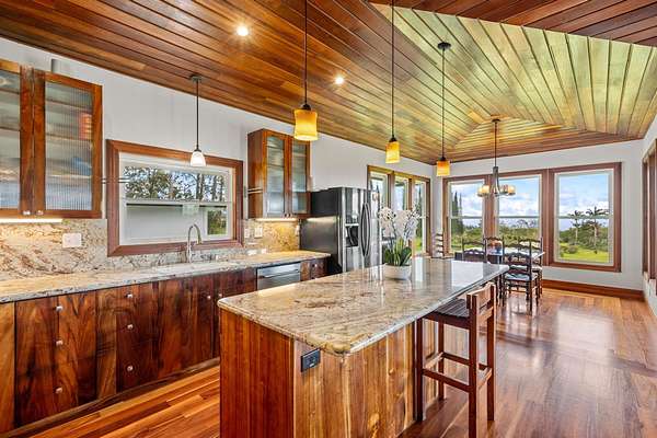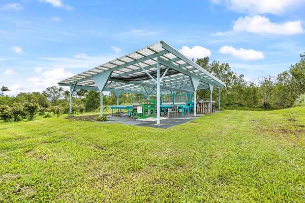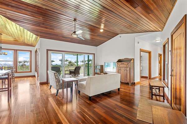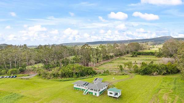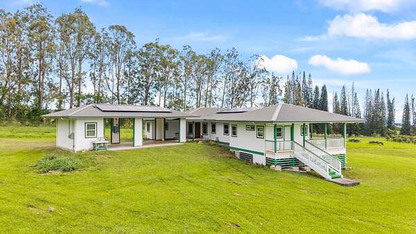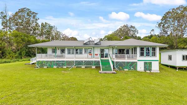 Modern plantation style home built by R.K. Woods Construction on a rarely available 20 acre parcel. Bordered by Makea Stream, the property features gently sloping, cultivated land with established farm infrastructure, along with ocean and Mauna Kea views. Located in Pepeekeo just north of Hilo with convenient access to town, shopping, and services. With easy on grade access from the carport, the home is elevated by post and pier footings and oriented to capture trade wind breezes through walls of windows and sliding doors for ambient cooling. The open great room features vaulted 9' ceilings, while a split floor plan places the guest bedroom and full bath adjacent to the main living space. Quality interior finishes include custom koa cabinetry, solid granite counters, eucalyptus robusta floor and ceilings, and porcelain tile bathroom floors. An office with a shoji door and lanai glass slider can serve as an additional guest room. The primary suite is located at the far end with a private entrance to a lanai that begins at the living room and wraps around the suite, separated from the office by a well-sized laundry room. The primary bedroom includes a walk-in closet and a pass-through bathroom with dual vanities and a marble tiled shower between. Two exterior access points include a glass slider to the lanai and a second door through the bathroom, useful when coming in from working on the property. High speed internet and county water are in place, along with an owned 17 panel grid-tied PV system and EV charging. This is the established home of Mauna Kea Cacao LLC, a working farm with approximately 1300 cacao trees. A transferable agricultural tourism permit issued by the County allows farm tours, chocolate tastings, and on site retail, along with separate parking for tours. Business available separately. Additional improvements include a covered carport with storage area, a cacao storage shed with loading dock, a tractor shed, gazebo, and tour parking.